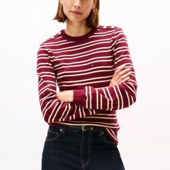 Gold-Button Stripe Crewneck T-Shirt-Burgundy