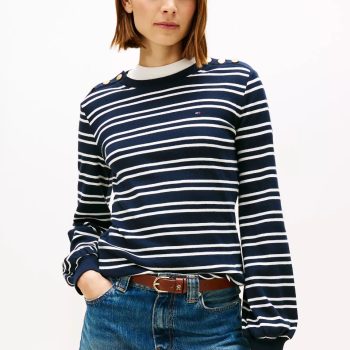 Gold-Button Stripe Crewneck T-Shirt Women-Navy Blue