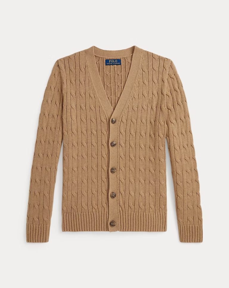 Cable-Knit Cotton V-Neck Cardigan Kids Boy-Camel Heather