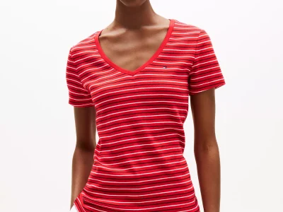 Stripe V-Neck Favorite T-Shirt- Primary Red Stripe#XW05026-XLG