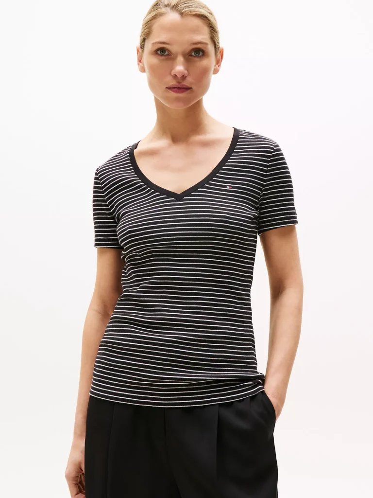 Stripe V-Neck Favorite T-Shirt-Black Stripe#XW05026-BDS