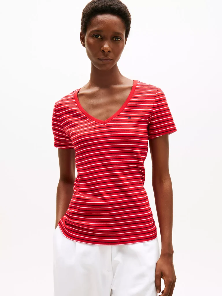 Stripe V-Neck Favorite T-Shirt- Primary Red Stripe#XW05026-XLG