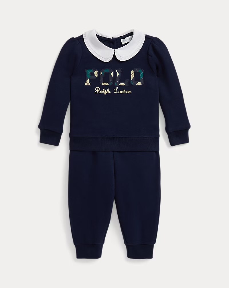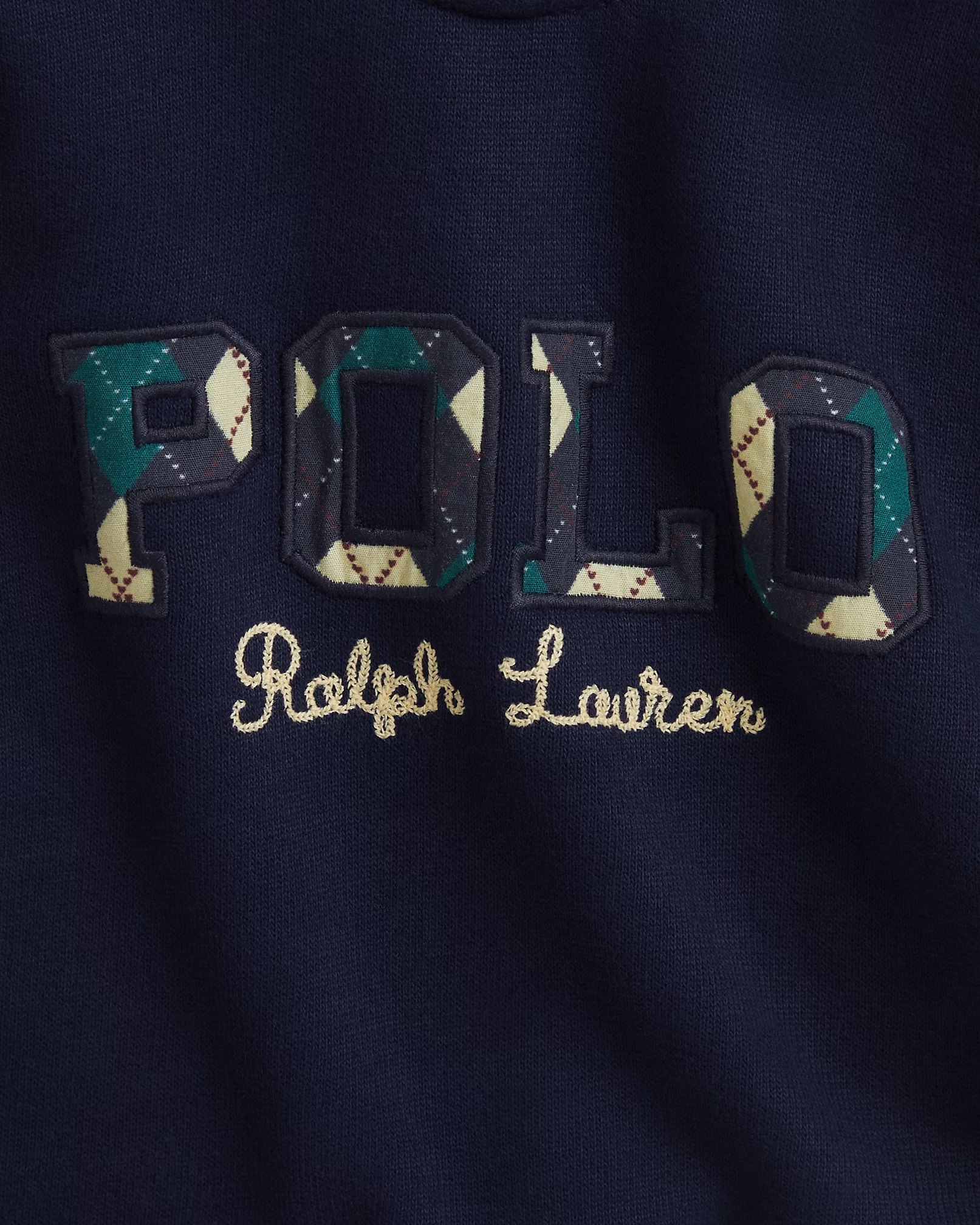 Part of the season’s prep school–inspired concept, this set is made with peached cotton-blend fleece and then washed for added softness. On the sweatshirt, our “Polo” logo is depicted with argyle appliqués.