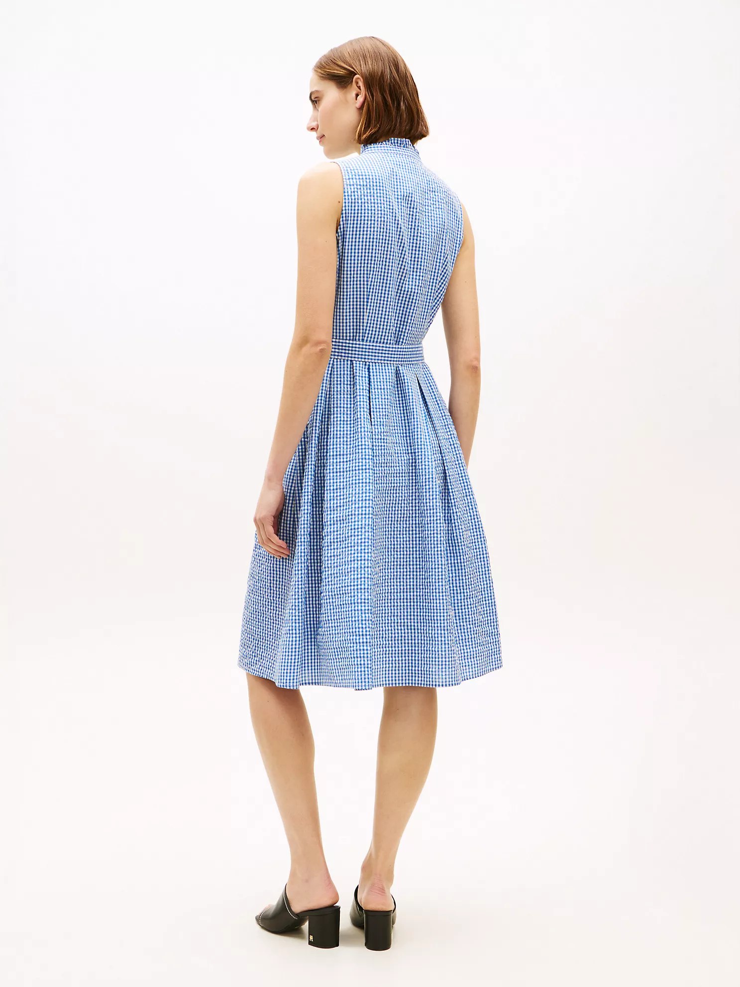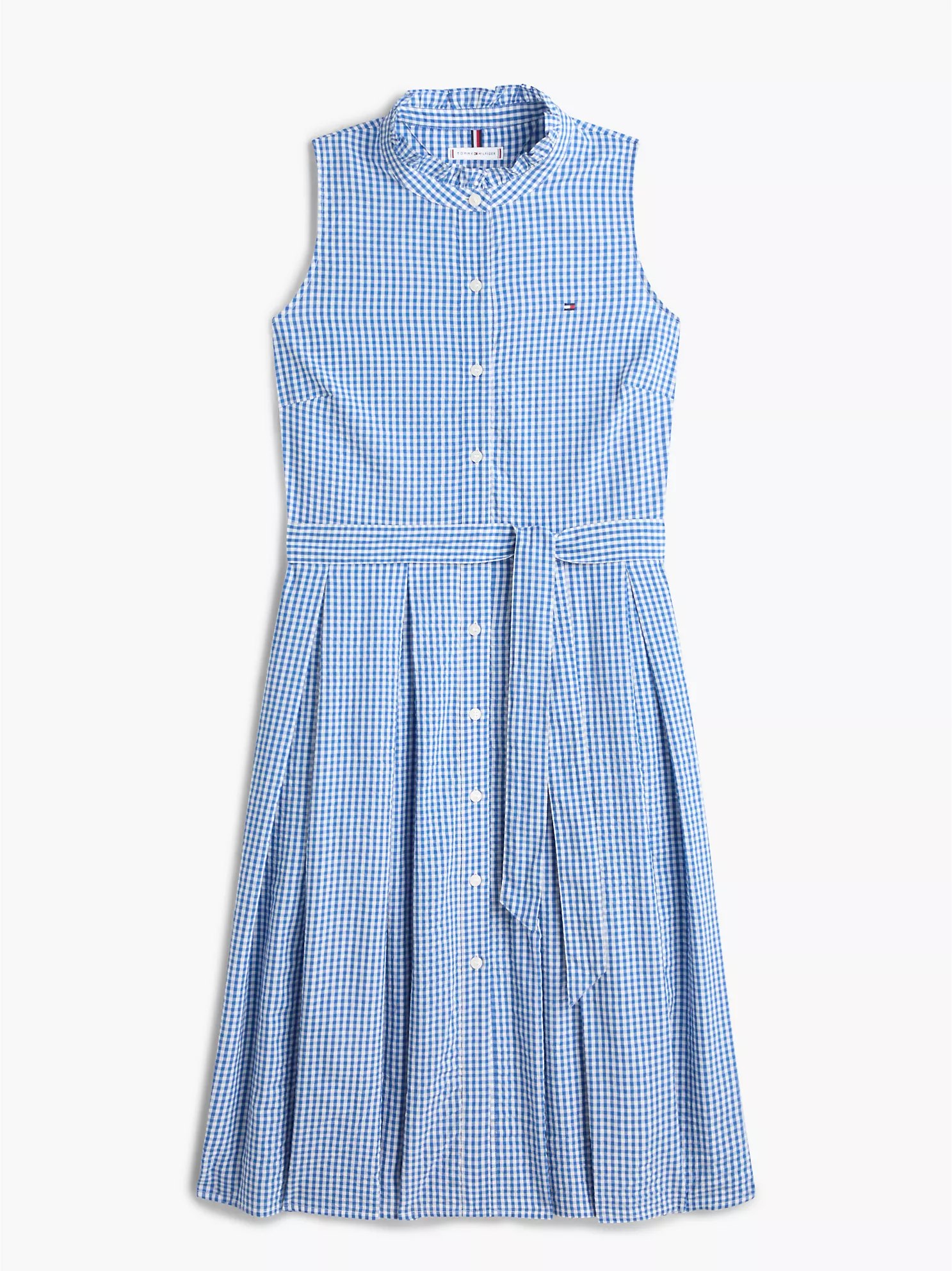 Tommy Hilfiger women’s dress. Made from lightweight seersucker, this gingham midi dress is breathable and wrinkle-resistant. Featuring a frill collar and structured pleats, itās ideal for warm-weather days when you want a polished, effortless look.