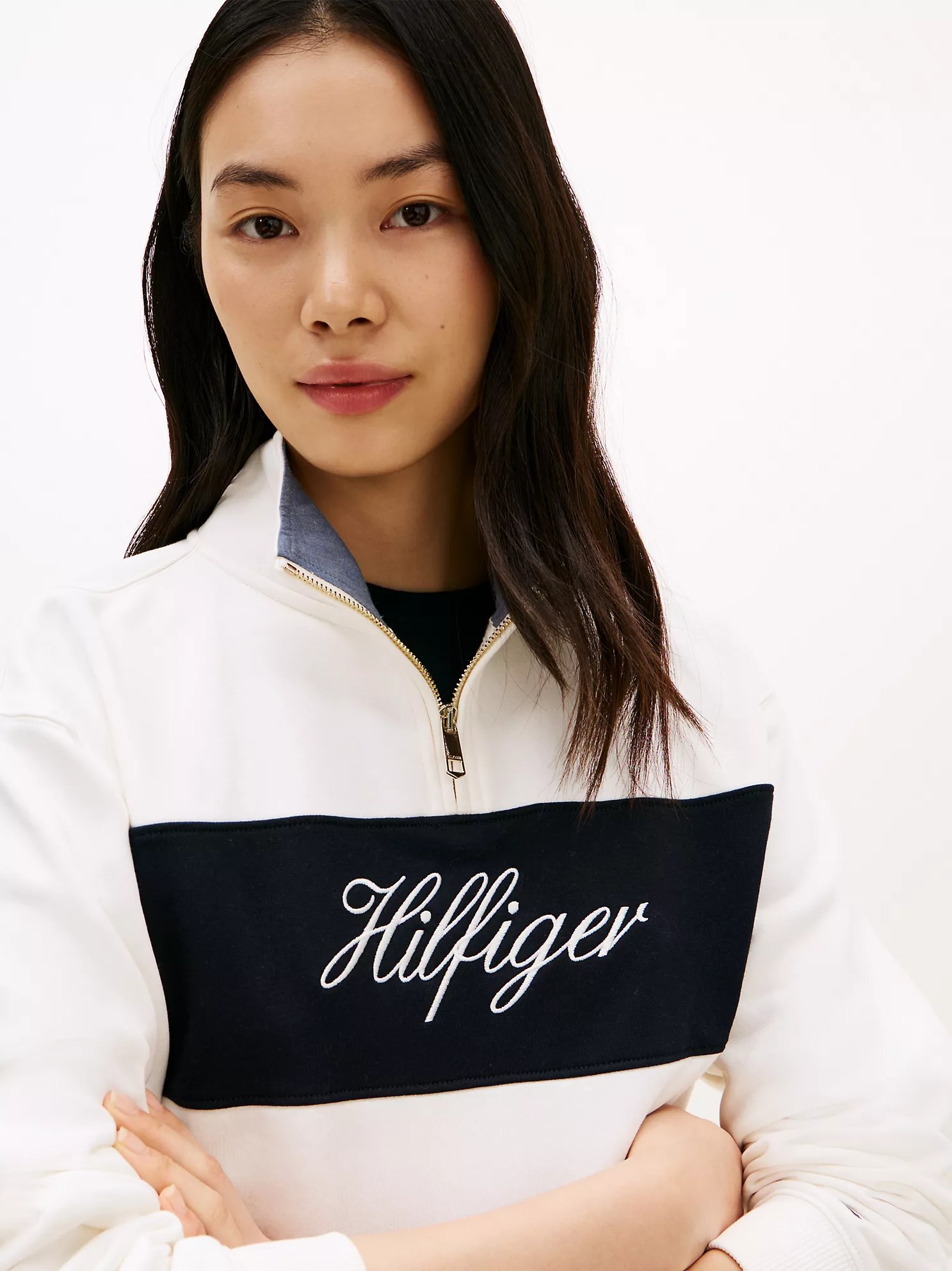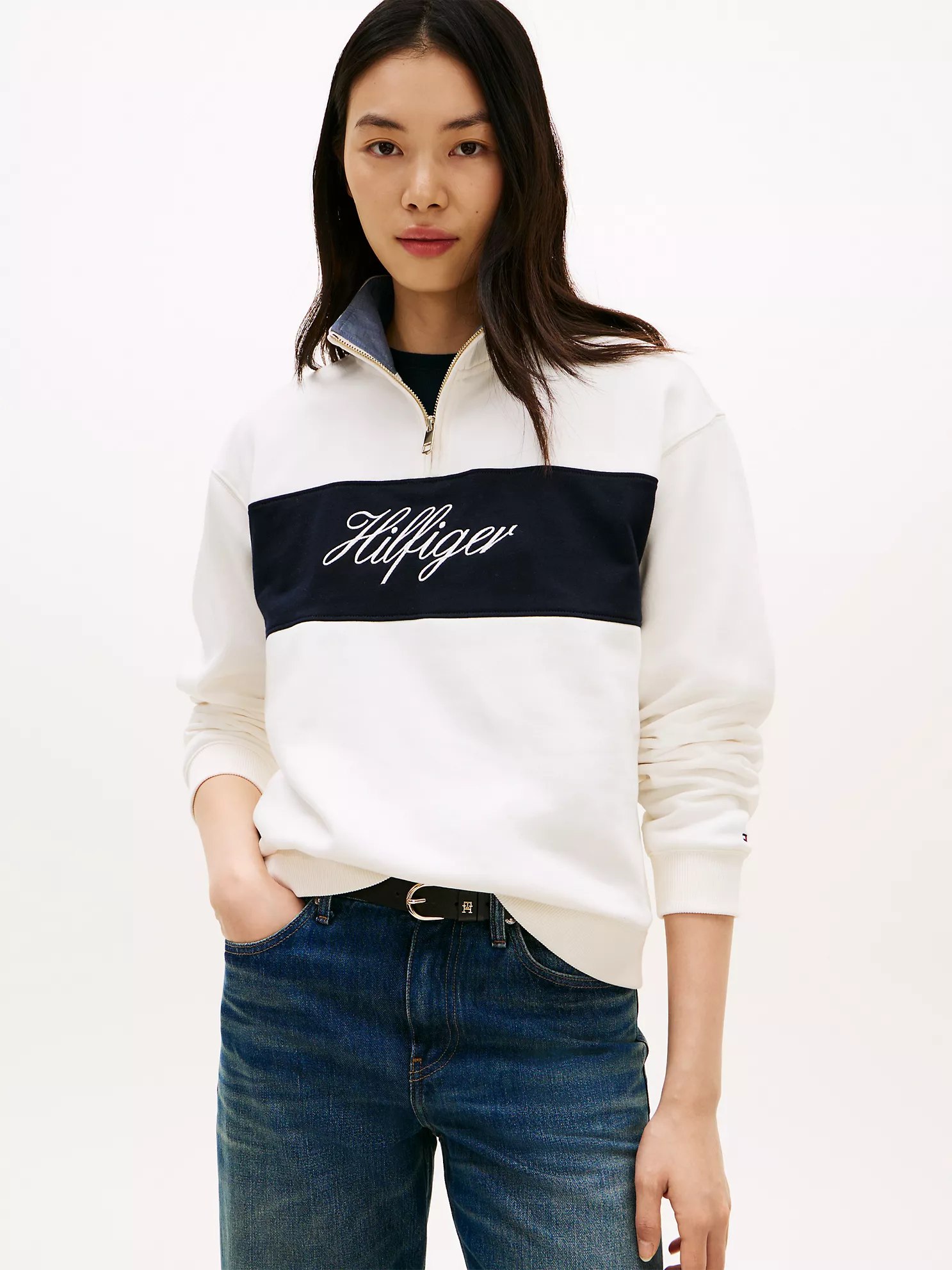 Tommy Hilfiger women’s sweatshirt. Made from brushed-back fleece with a flat, clean face, our relaxed quarter-zip sweatshirt feels smooth and comfortable. It’s been garment-washed with a special finish for added softness and durability.