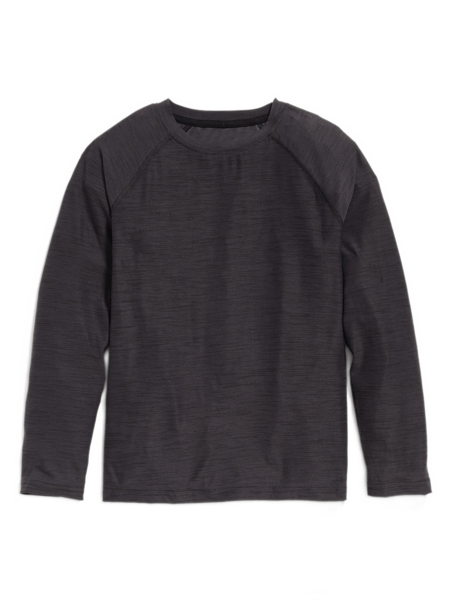 Crew neck. Long raglan sleeves. Soft, lightweight jersey, with subtle space-dye pattern. Go-Dry Cool wicking technology helps keep him cool, dry