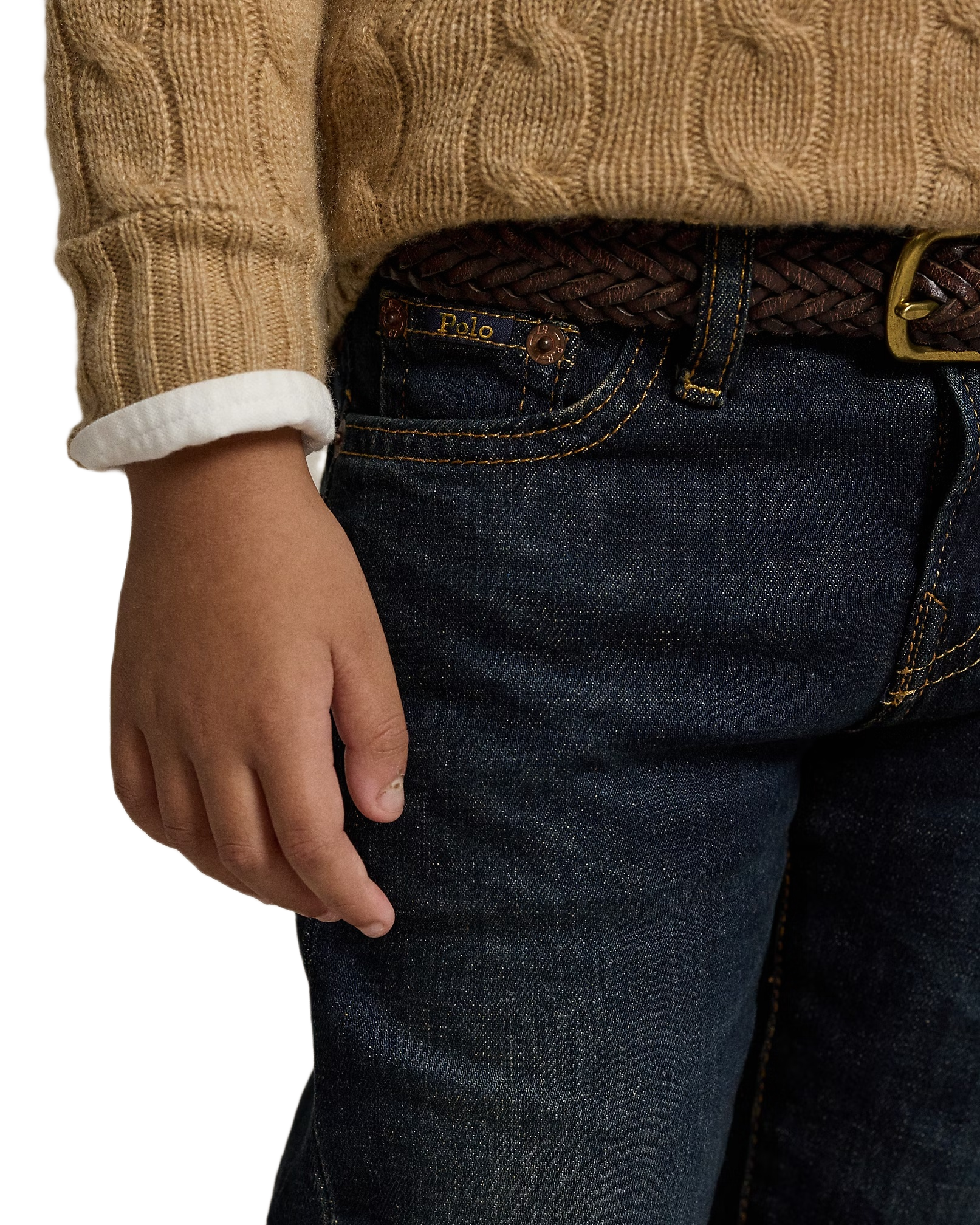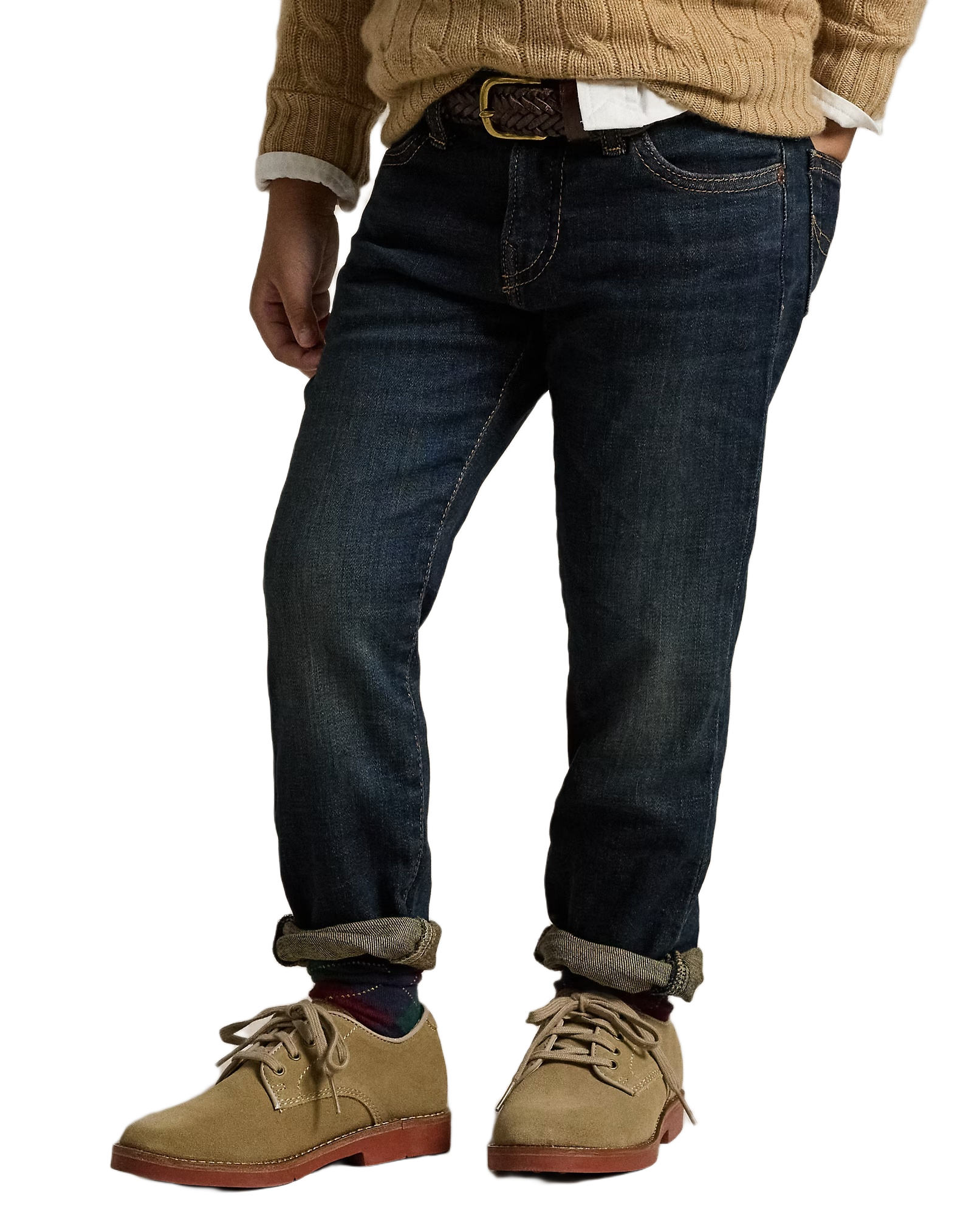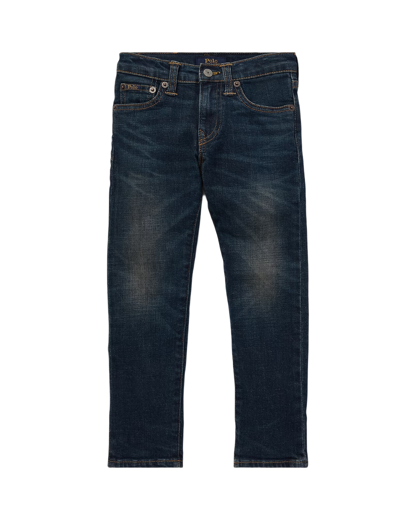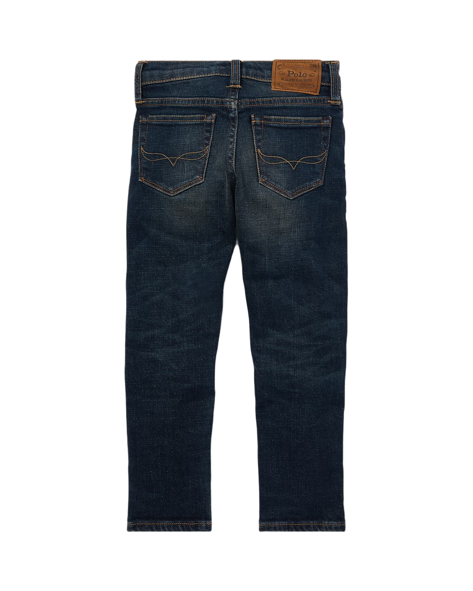 - Five-pocket styling with signature metal rivets. “Polo” label at the coin pocket. Faux-suede “Polo Ralph Lauren” label at the back right waist.