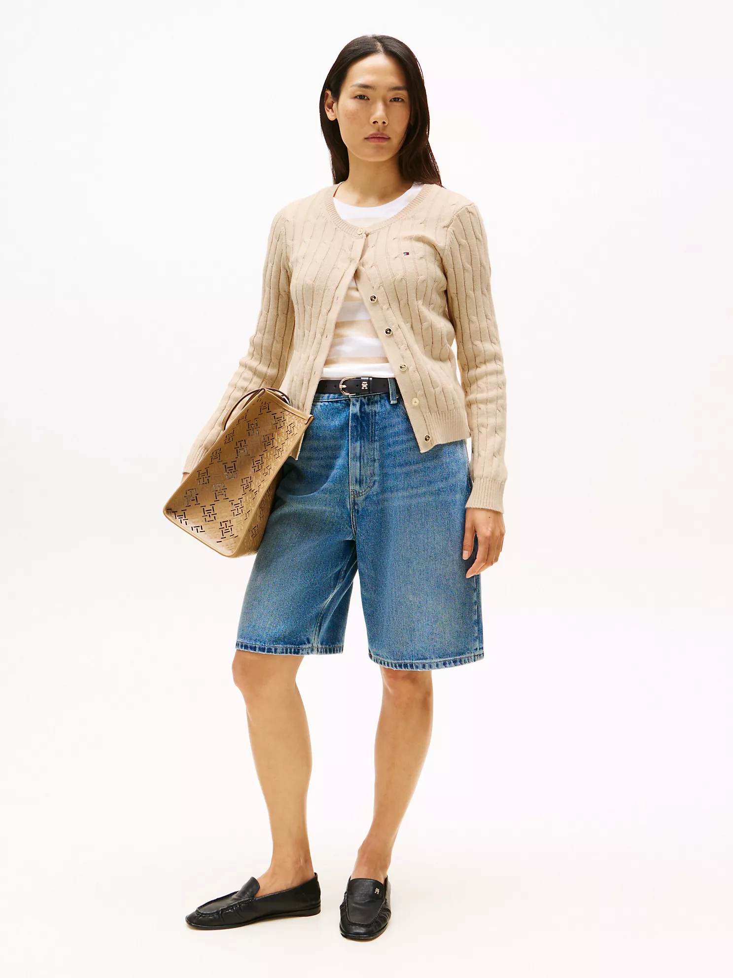 Tommy Hilfiger women’s sweater. Made from a soft, lightweight cotton weave, this textured cable knit button-up cardigan is a versatile transitional-weather layer.