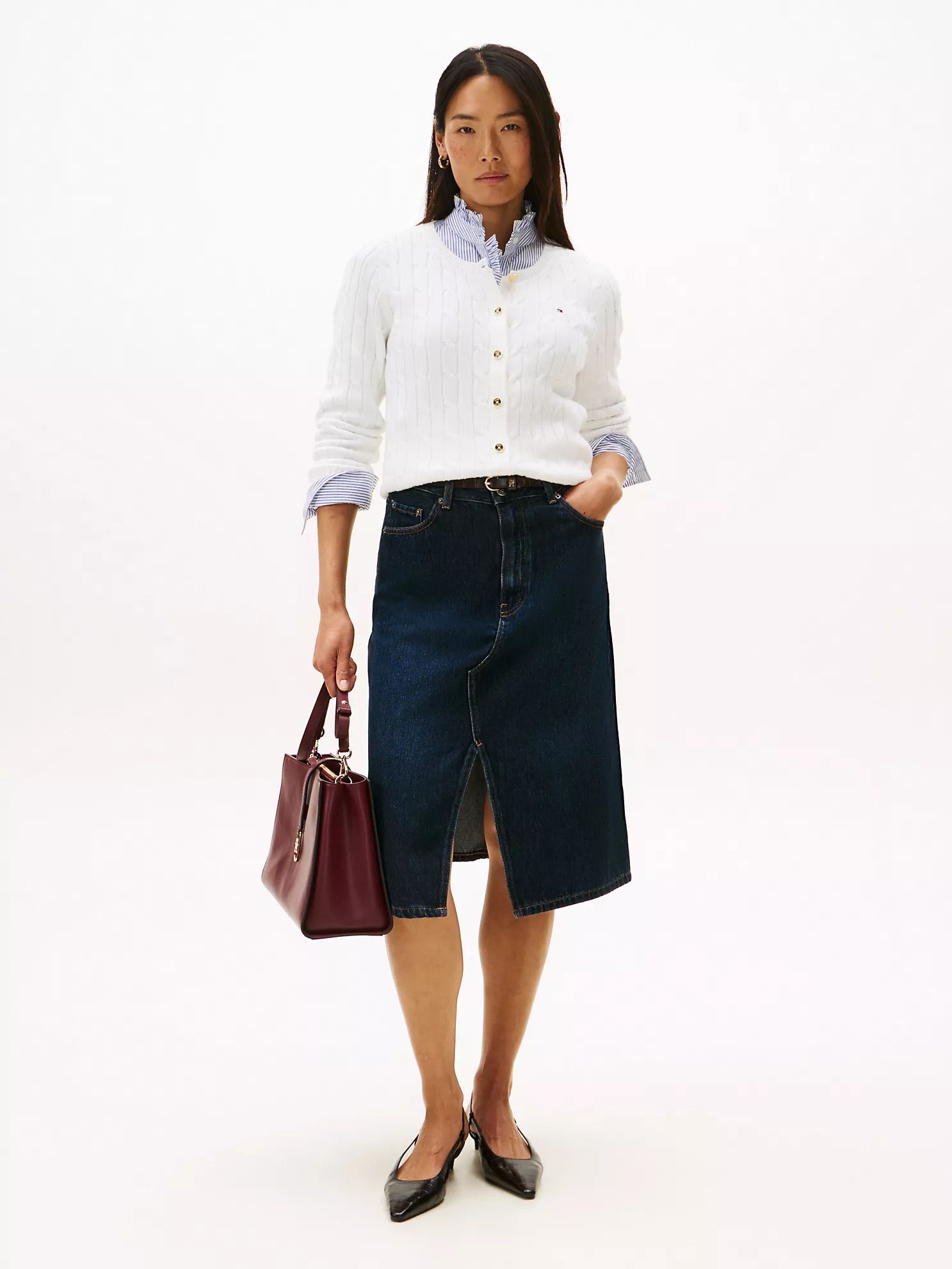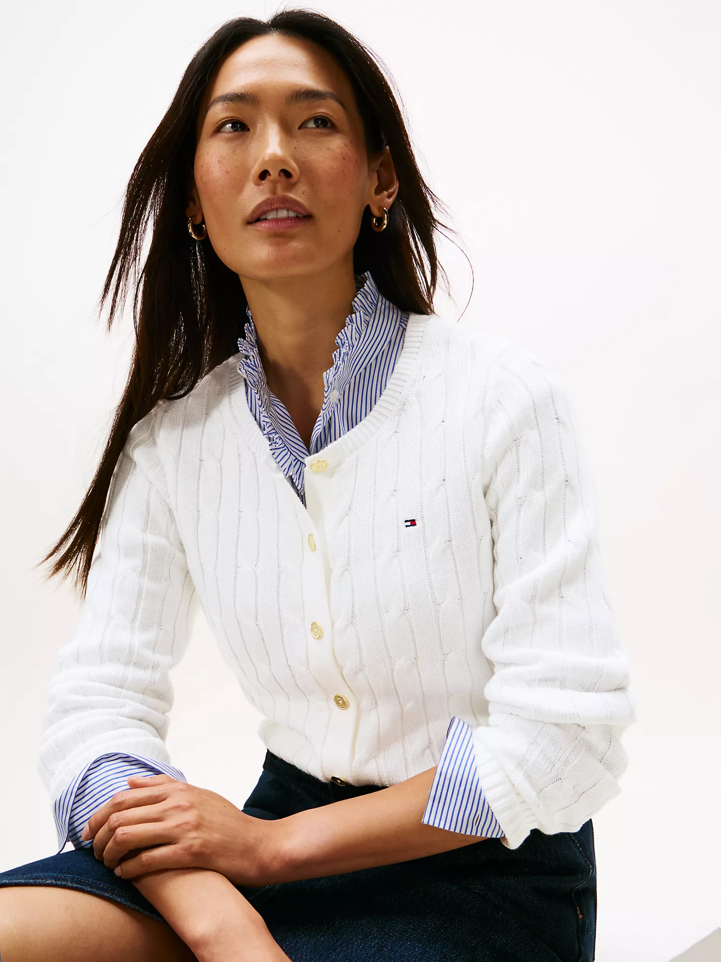 Tommy Hilfiger women’s sweater. Made from a soft, lightweight cotton weave, this textured cable knit button-up cardigan is a versatile transitional-weather layer.
