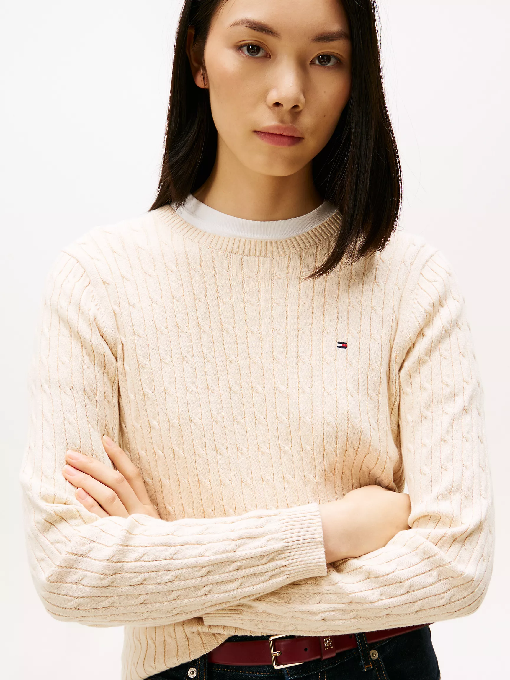 Tommy Hilfiger women’s sweater. Made from premium cotton in a flattering, easy fit, our lightweight long-sleeve cable knit sweater is a soft, comfortable layer.