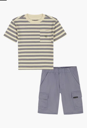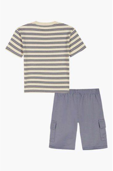 Give your kid casually cool style with this striped pocket T-shirt and pull-on cargo shorts set made from soft, breathable cotton.