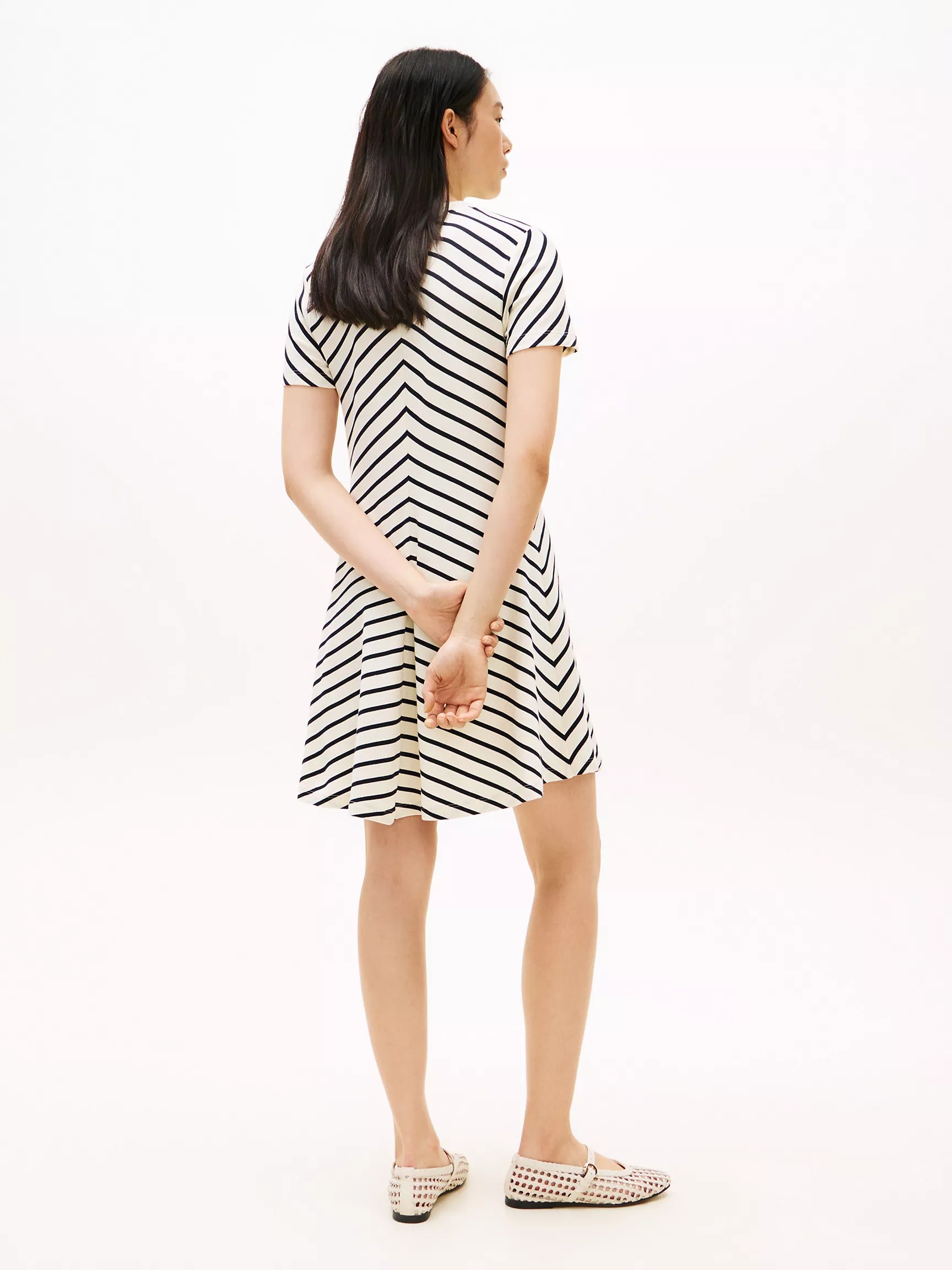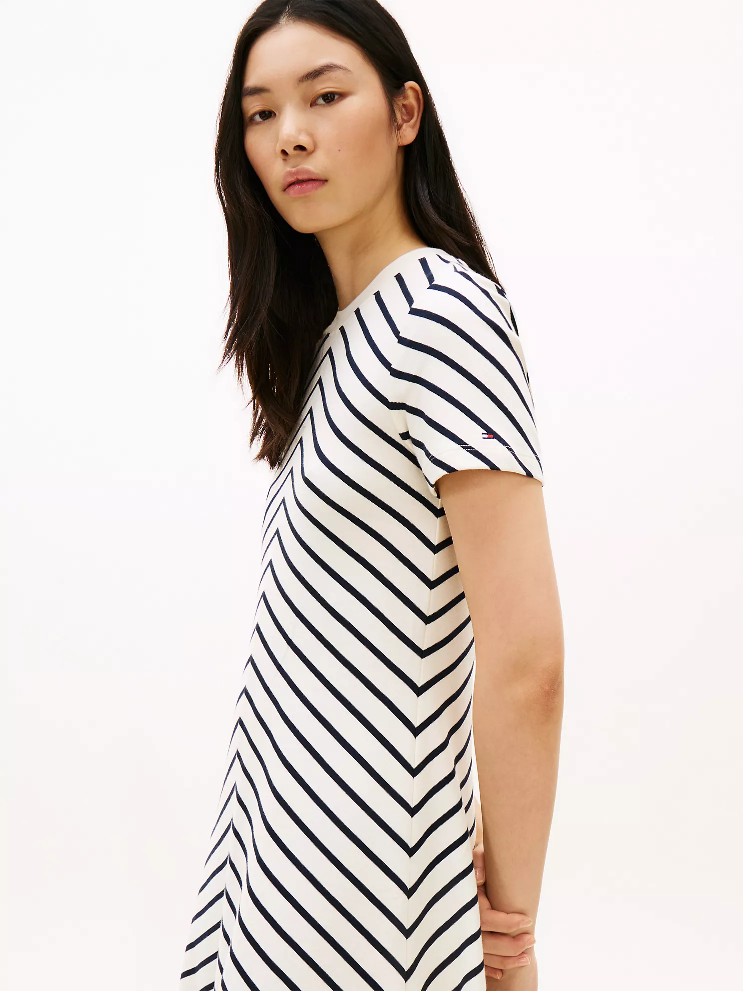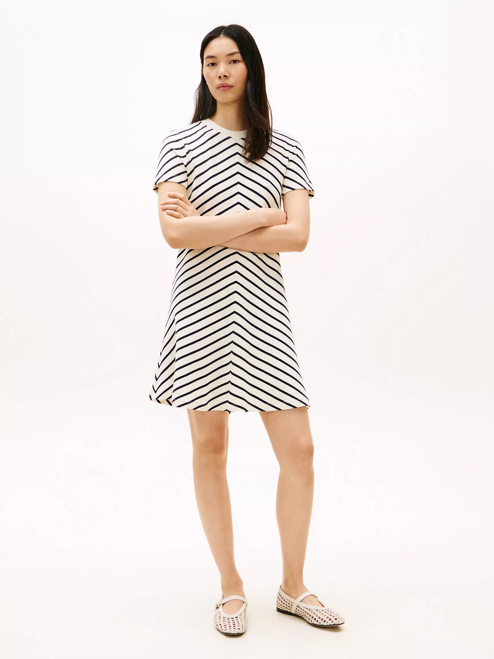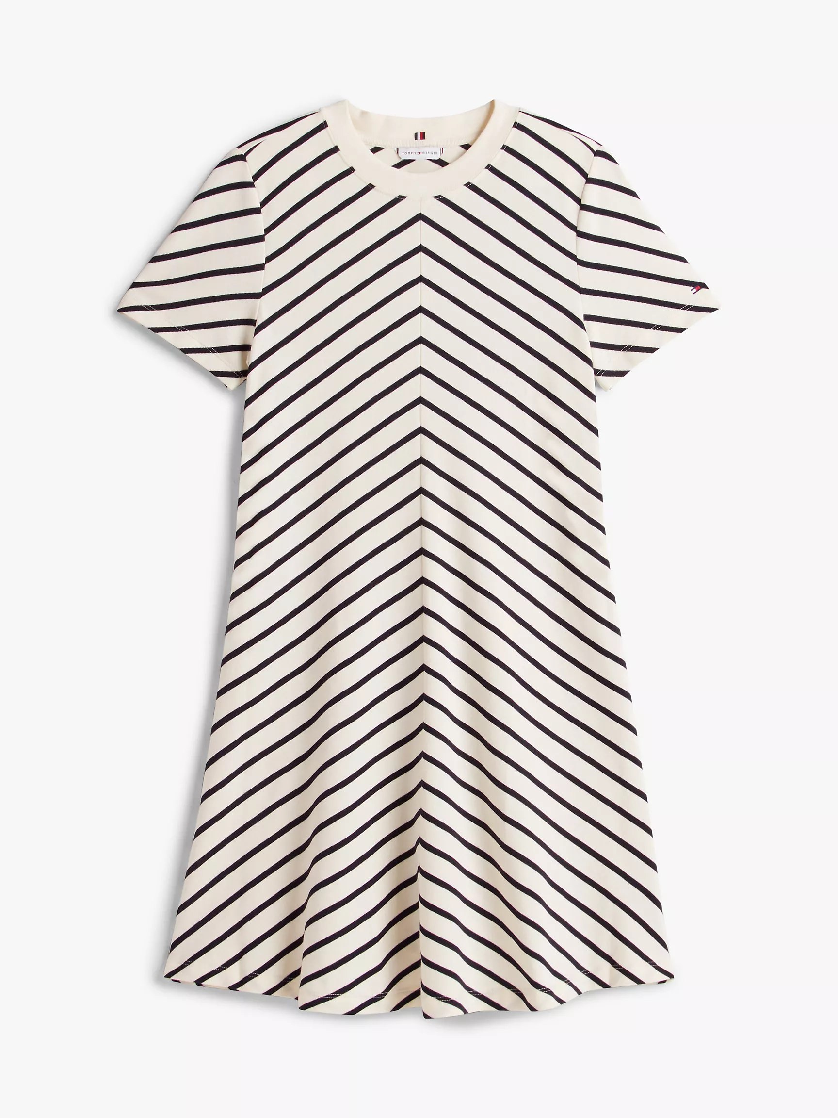 Tommy Hilfiger women’s dress. Our smooth cotton interlock dress features vibrant, yarn-dyed chevron stripes that resist fading. A flattering fit-and-flare silhouette transitions effortlessly from workdays to weekends.