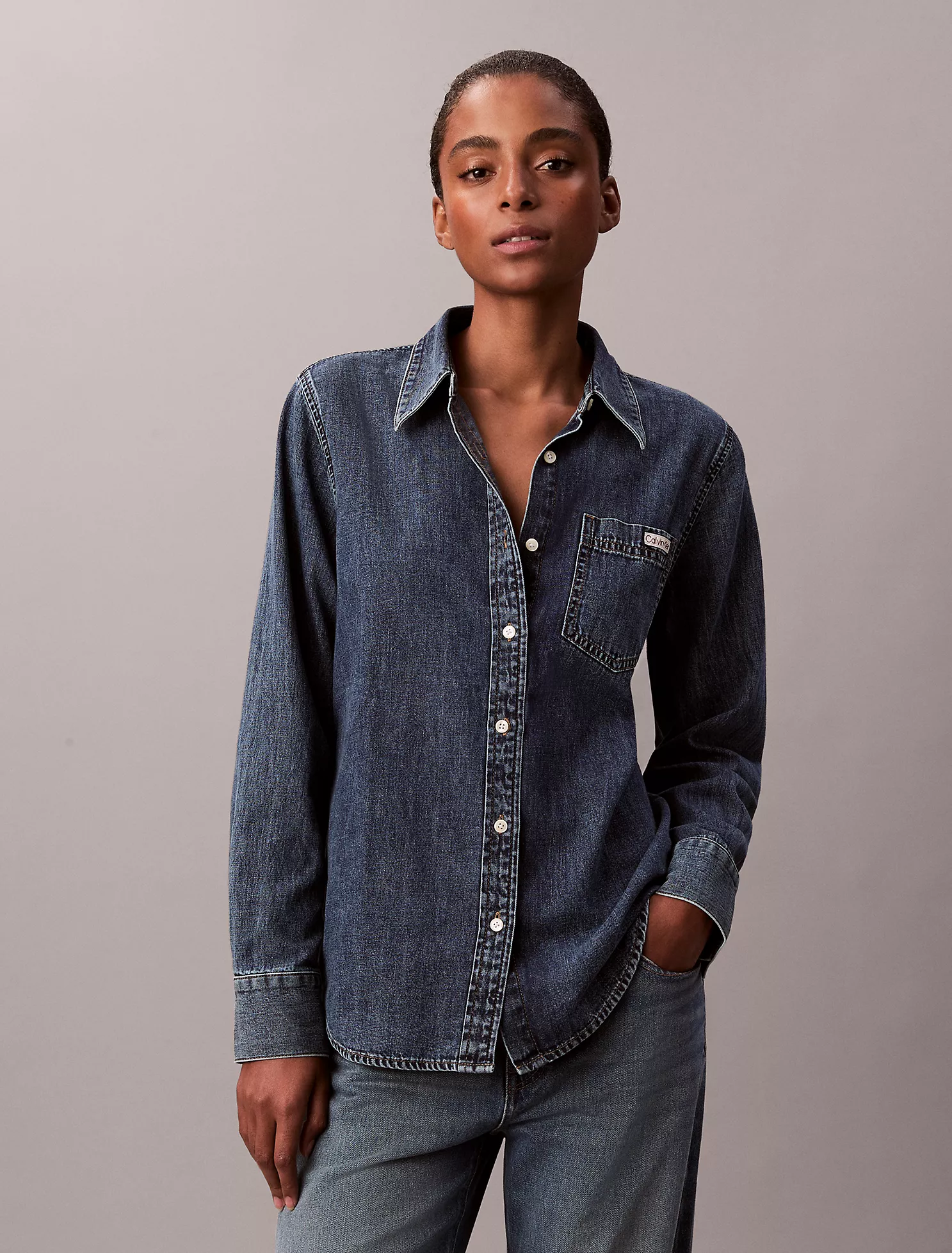 A classic denim button-down shirt made from 100% cotton. This shirt has long sleeves and a point collar. Designed with a patch pocket at the upper chest.
