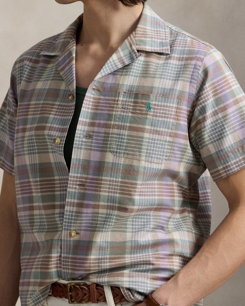 The oxford shirt made its debut very early on in Ralph Lauren’s designs, and since then it has solidified its status as a pillar of the Polo look. Our fabric is developed with a secret wash that gives it instant character, ease, and a heathered softness—what we call the perfect “rumple.” The formula is so unique, it’s been kept in a safe for more than three decades. Today, Mr. Lauren continues to create countless variations of his iconic shirt, including this camp-collar version that features a classic plaid pattern.