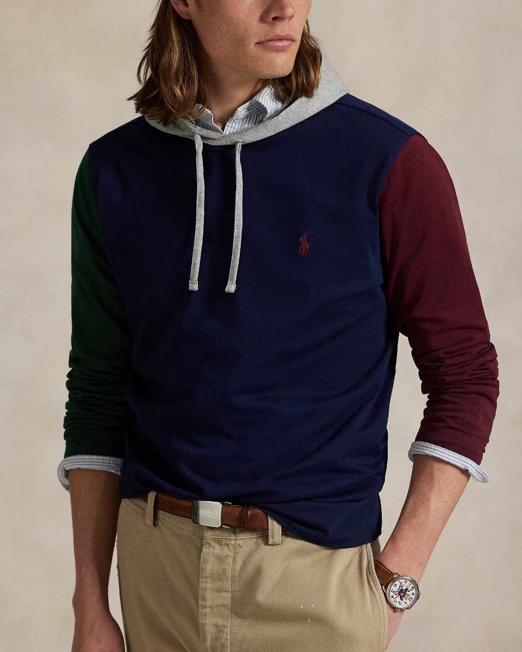This color-blocked layer combines the look of a hoodie with the lightweight feel of your favorite cotton T-shirt.