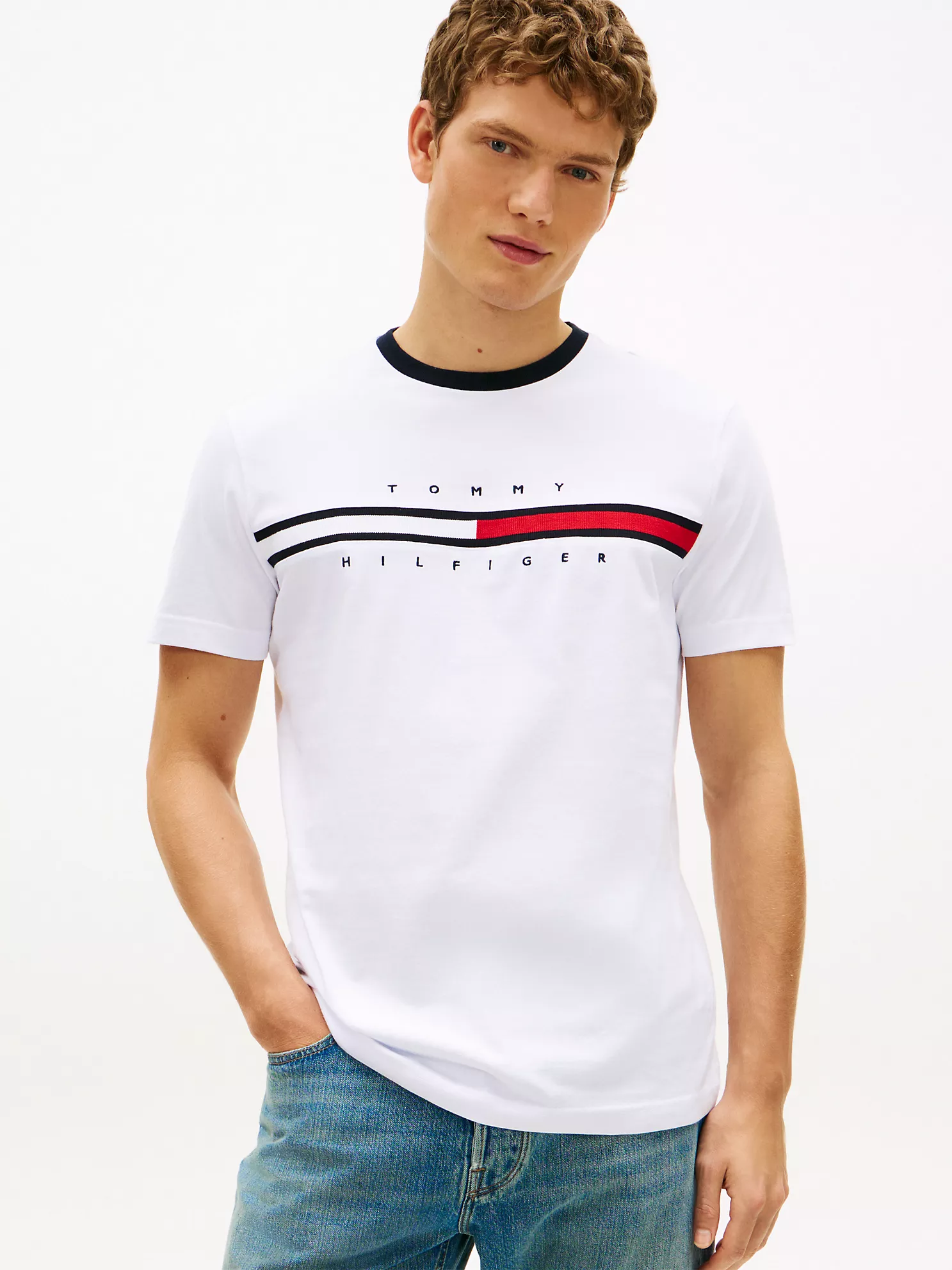 Tommy Hilfiger men’s T-shirt. Made from lightweight cotton jersey, known for its breathability and stretch, our comfortable crewneck tee is cut in an easy fit and finished with our embroidered flag logo.