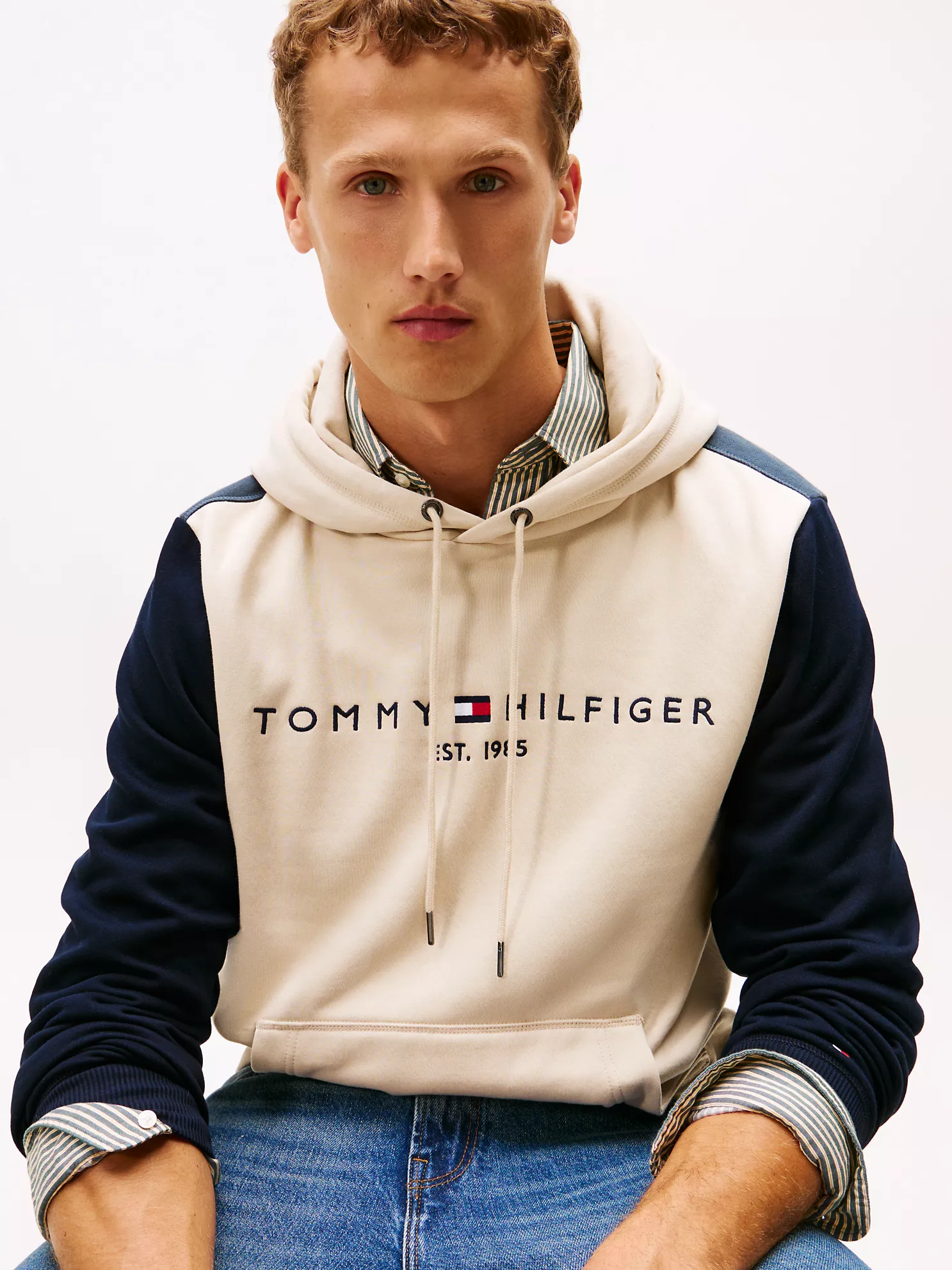 Tommy Hilfiger men’s hoodie. Our seriously soft pullover hoodie is made from brushed-back fleece with a flat, clean face and smooth feel. This layer features a colorblock finish and is designed with kanga pockets.