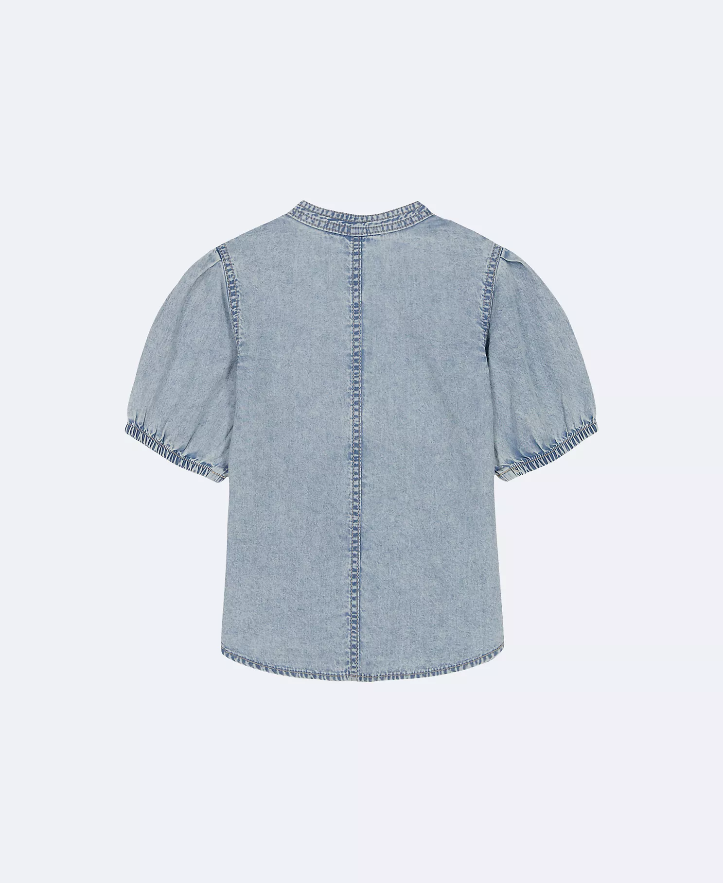 A denim button-down shirt with puffed sleeves and a round collar. Designed with flap pockets at the upper chest and accentuated with seams along the front.