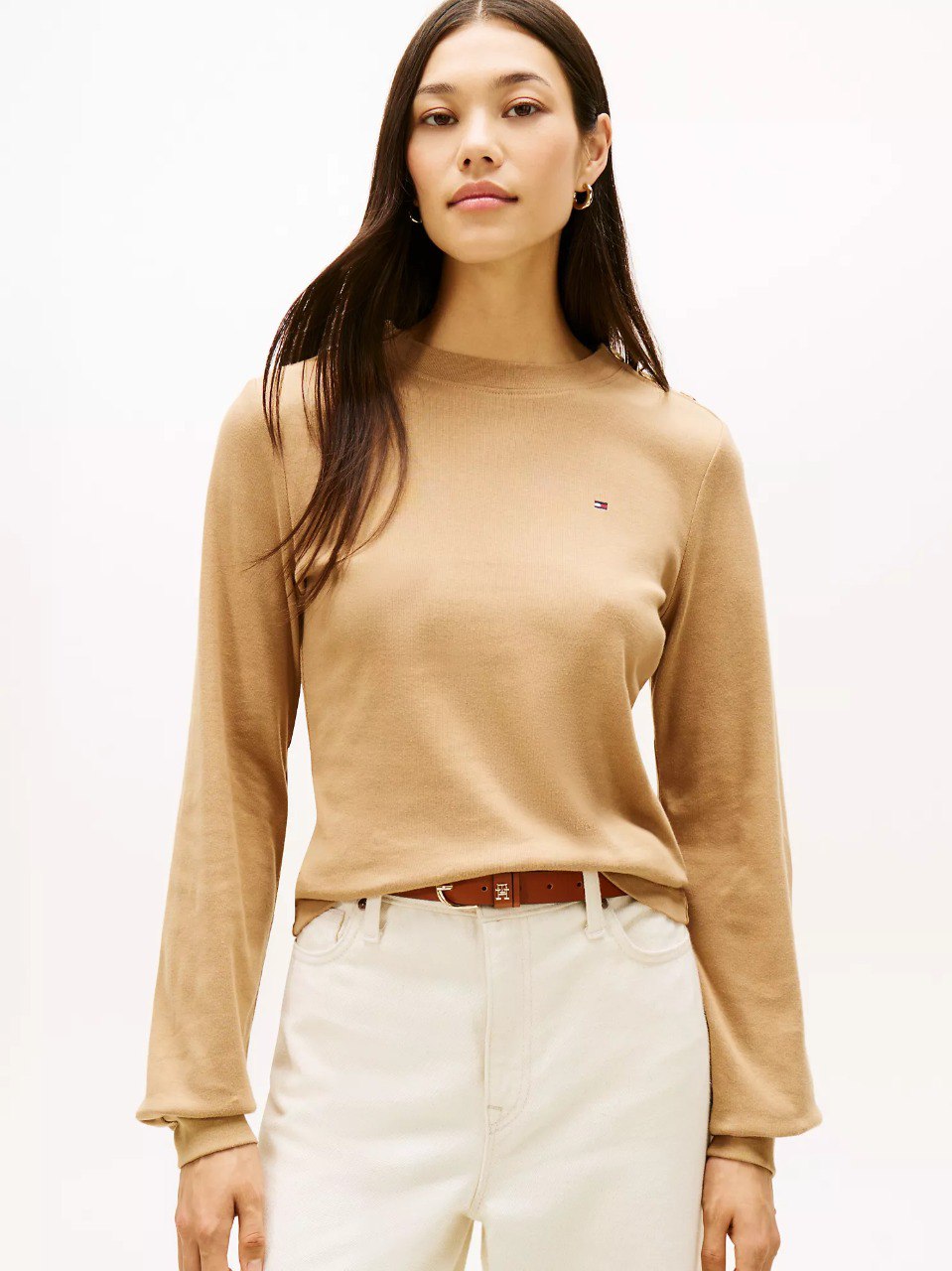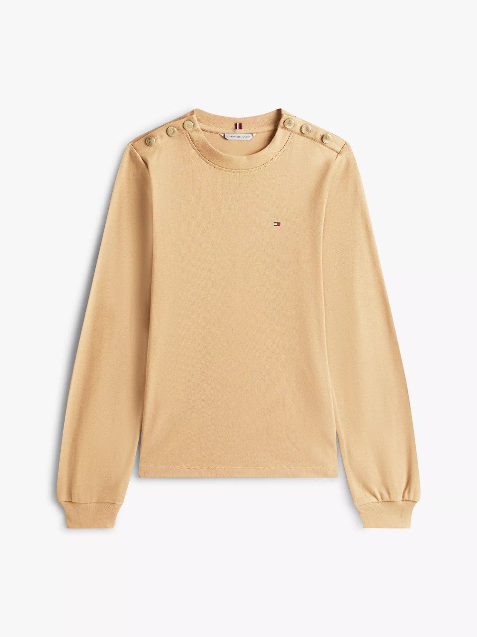 Tommy Hilfiger women’s T-shirt. Made from pure cotton, this soft crewneck tee has an easy, flattering fit. Inspired by classic nautical design, it features gold button details along the shoulders.