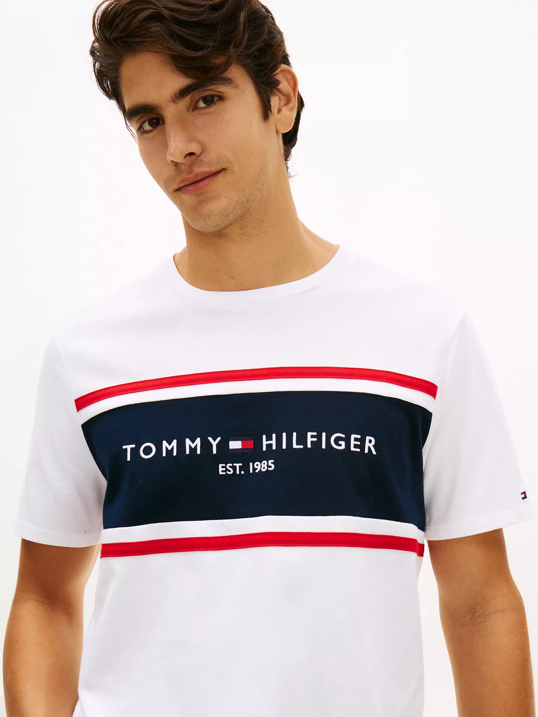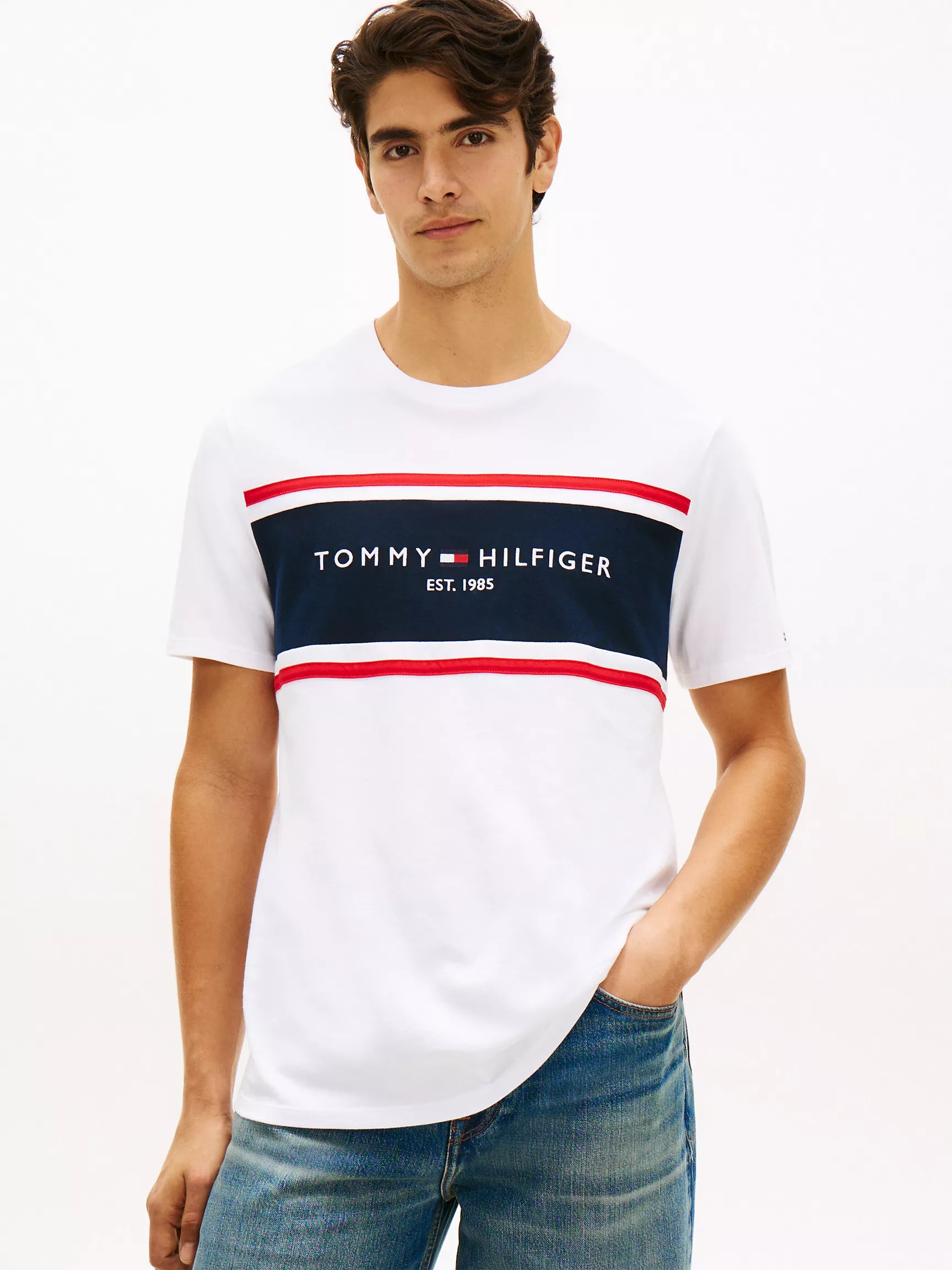 Tommy Hilfiger men’s T-shirt. Made from a cotton-jersey knit with a smooth, soft feel and excellent stretch, our Hilfiger block stripe logo tee is super comfortable.Details
