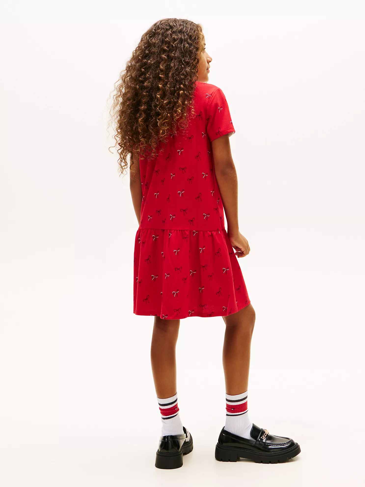 Kids’ Bow Print Stretch Polo Dress-Primary Red