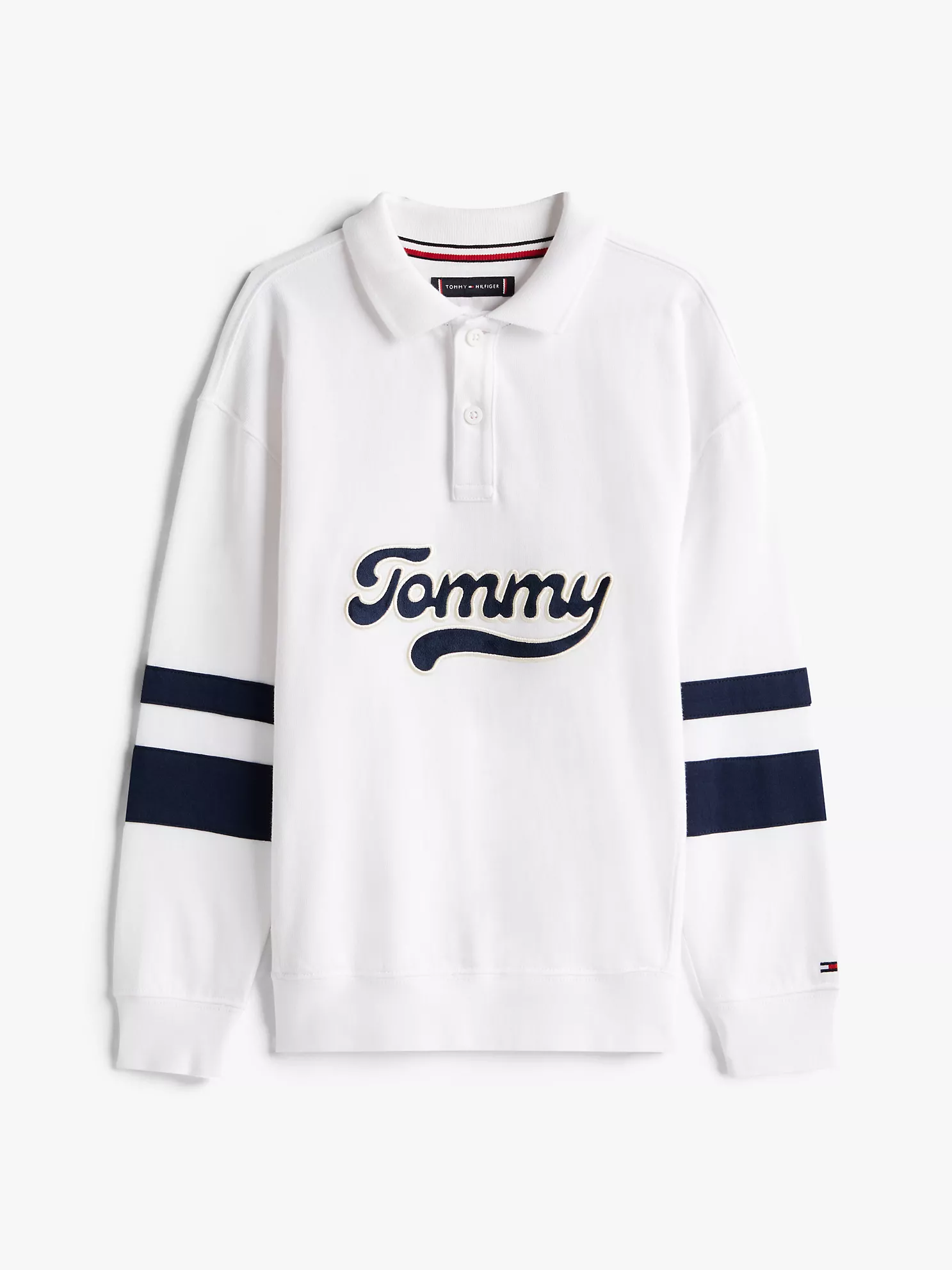 - Button placket, long sleeves, ribbed collar and cuffs, logos at the chest and back.