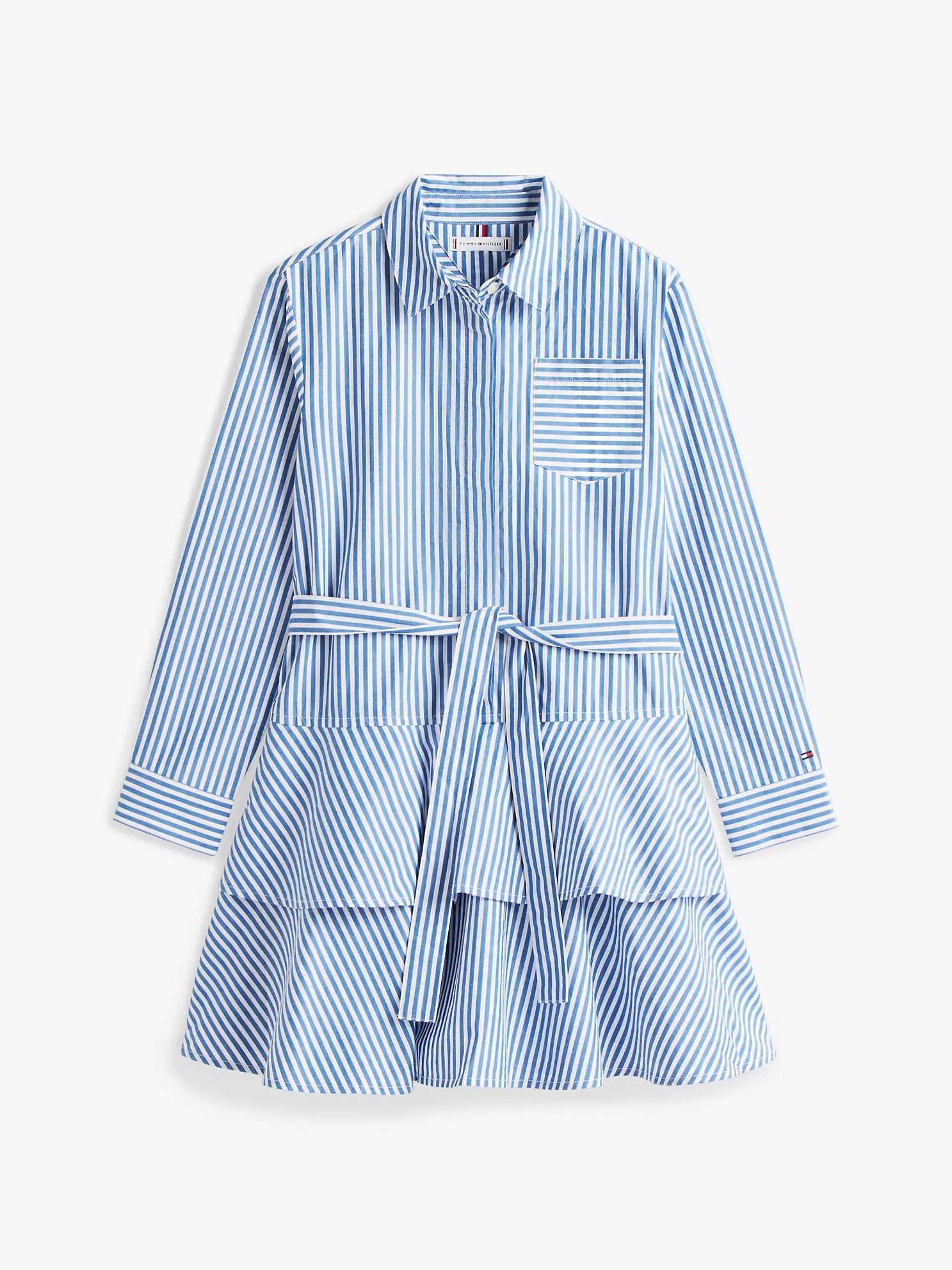 • Button placket, spread collar, long sleeves, self-tie belt, chest pocket, button cuffs, tiered silhouette.