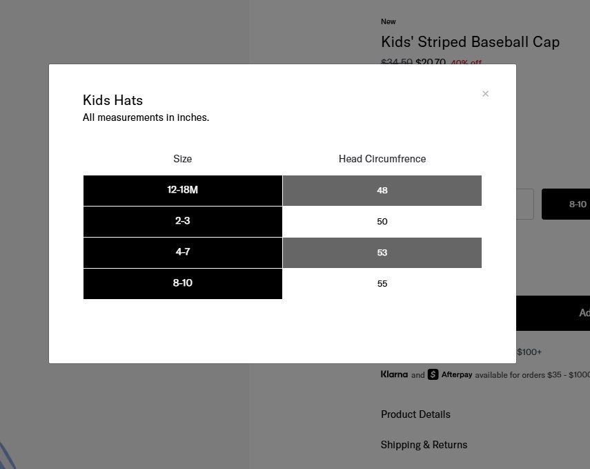 | Size Cap (Baby/Toddler/Kids): No selection | 2-3, 4-7, 8-10 |