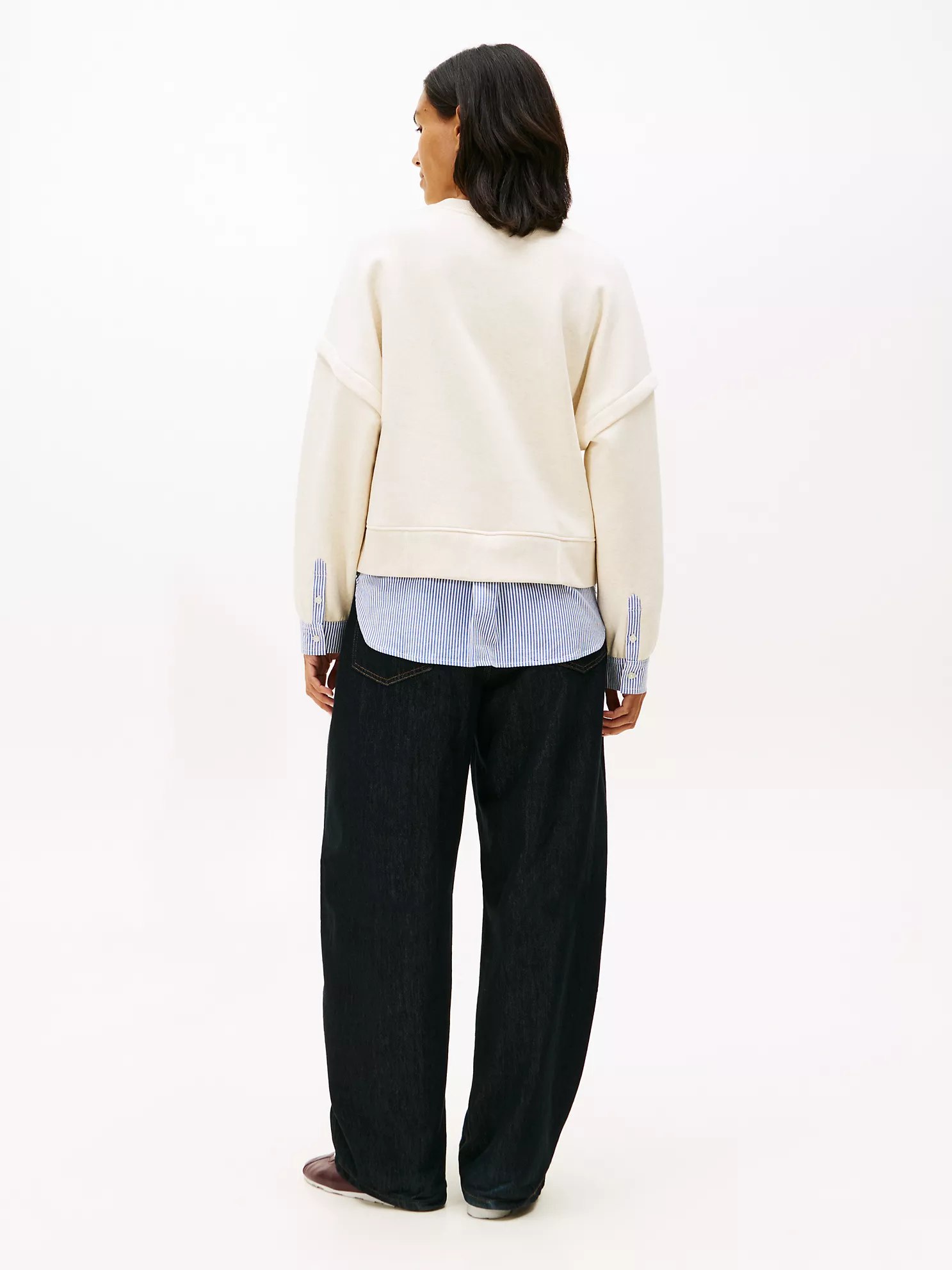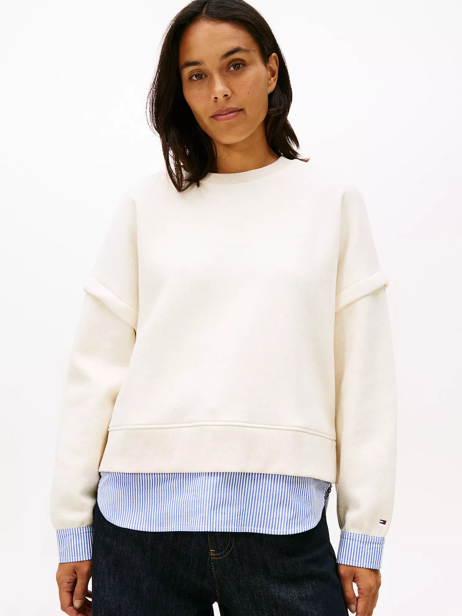 Tommy Hilfiger women’s sweatshirt. Made from soft, brushed-back fleece, our sweatshirt features a striped poplin shirttail and cuffs, creating an effortlessly layered look—without the bulk.