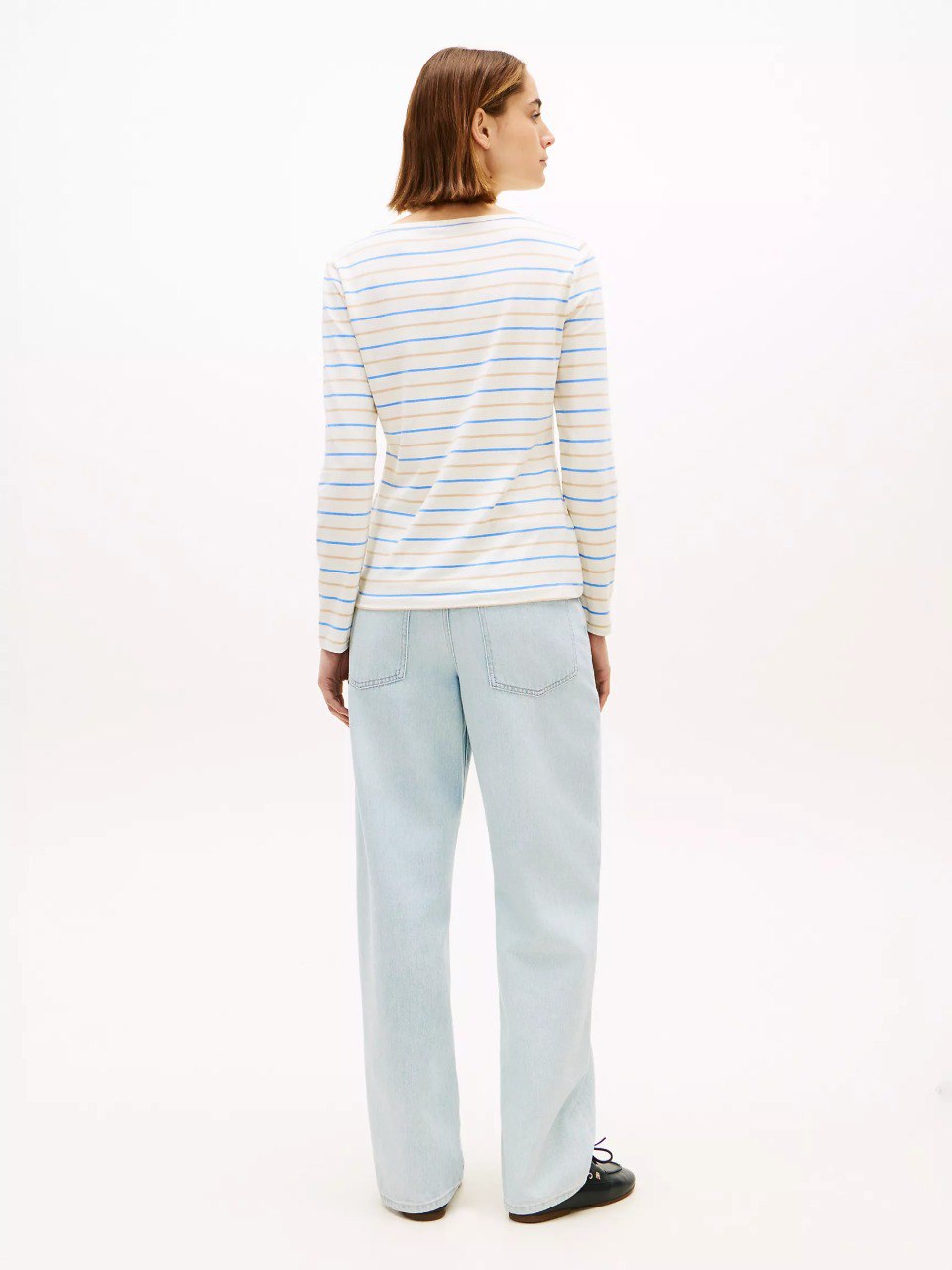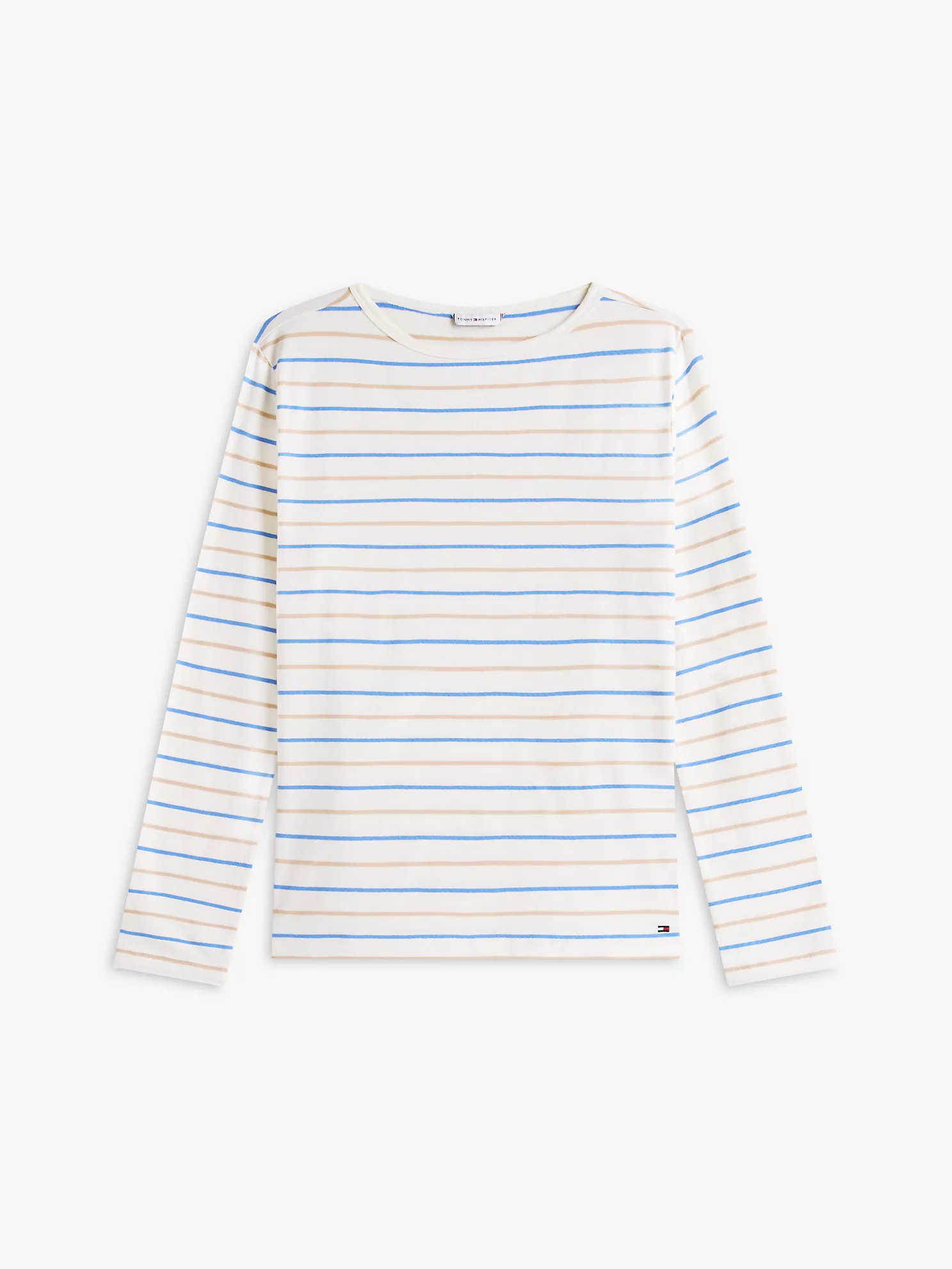 Tommy Hilfiger women’s T-shirt. Made from a premium cotton blend, this long-sleeve tee is designed in a boatneck silhouette. Lightweight, stretchy and breathable, itโs an effortless essential for everyday wear.