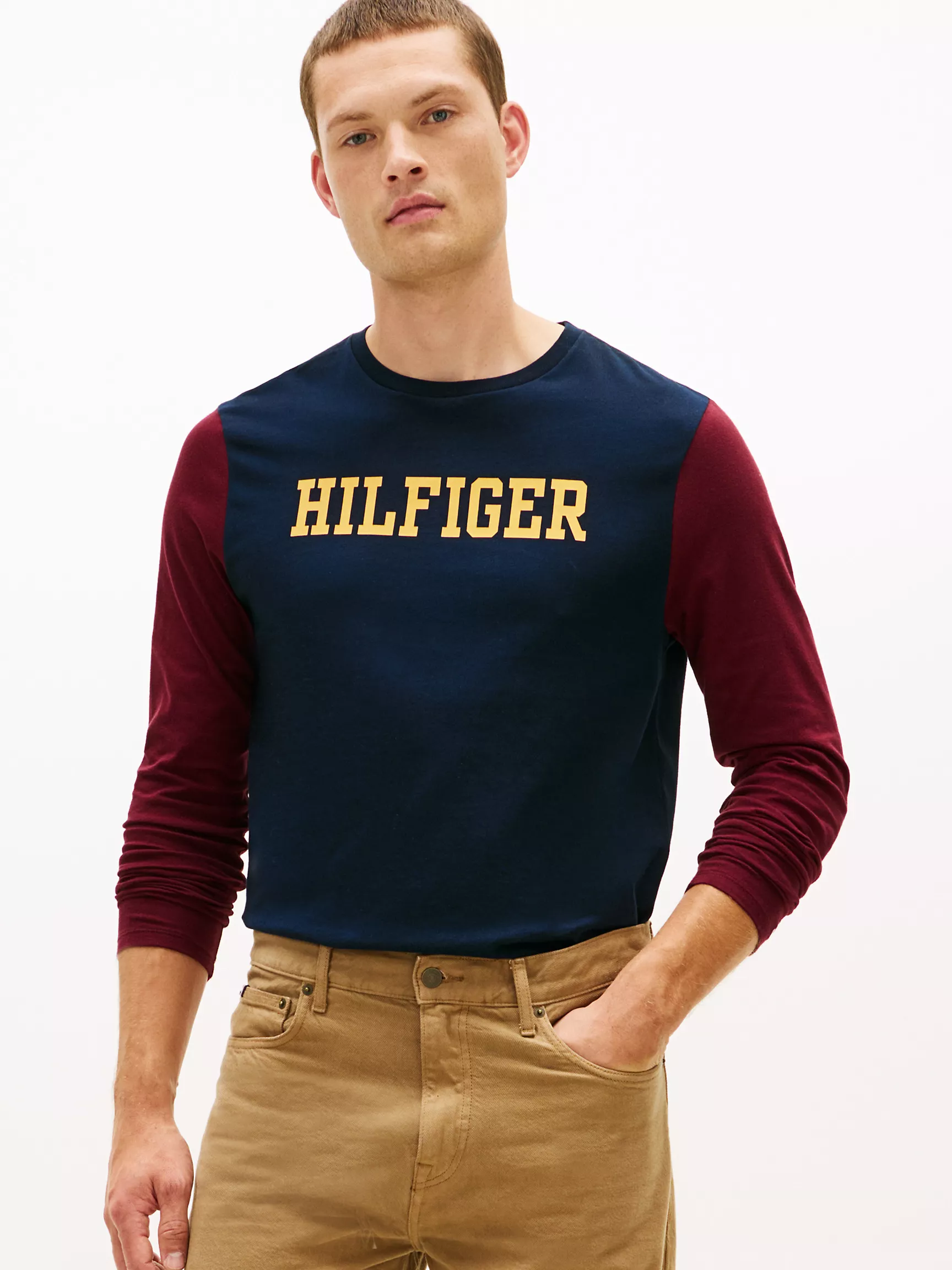 Tommy Hilfiger men’s T-shirt. Our long-sleeve tee is made from cotton jersey for a smooth, soft feel and excellent stretch. Colorblock details and our arched varsity Tommy logo add to the sporty feel.