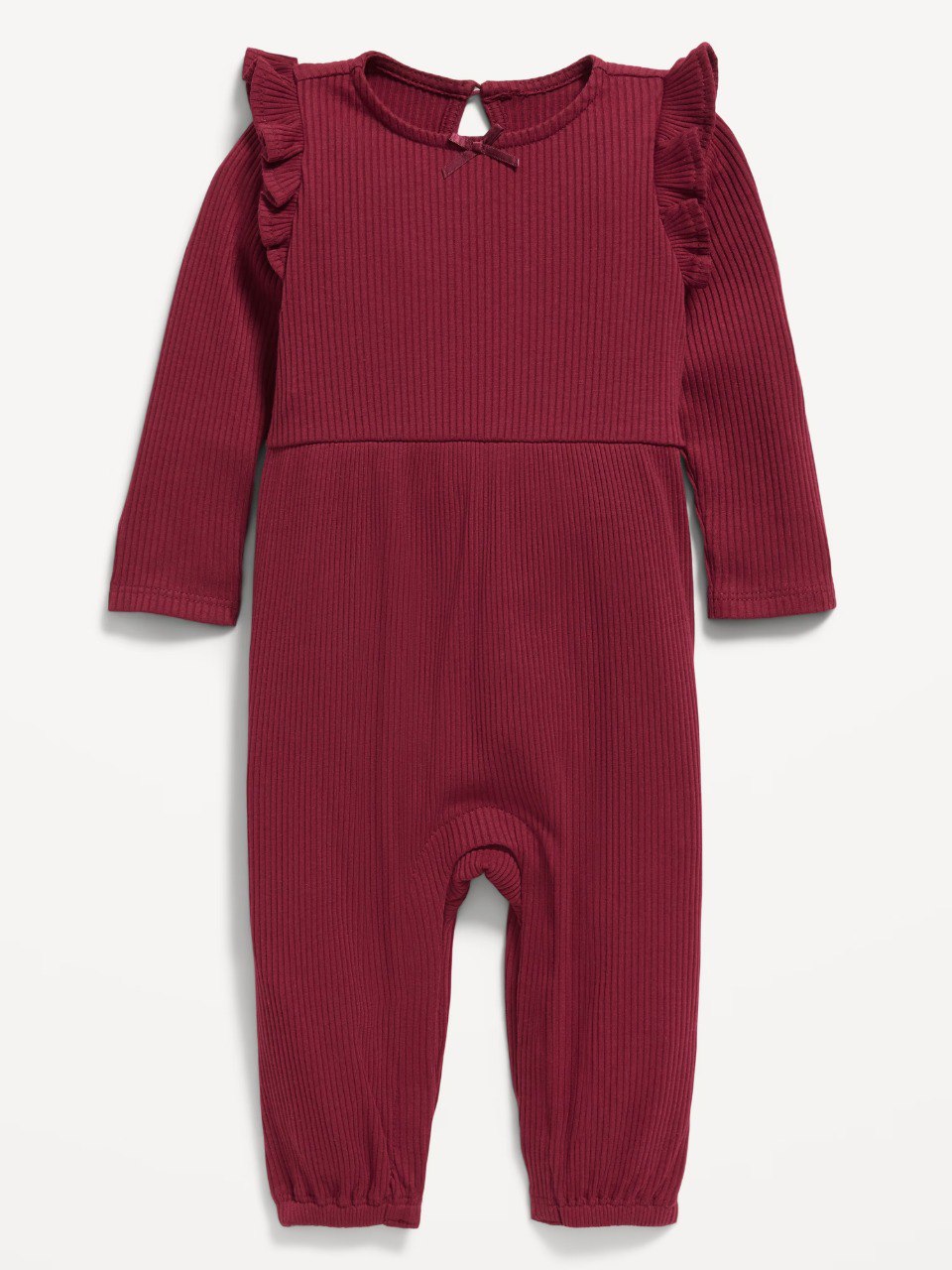 Long-Sleeve Ruffle-Trim Ribbed Jumpsuit for Baby – Cherry Red
