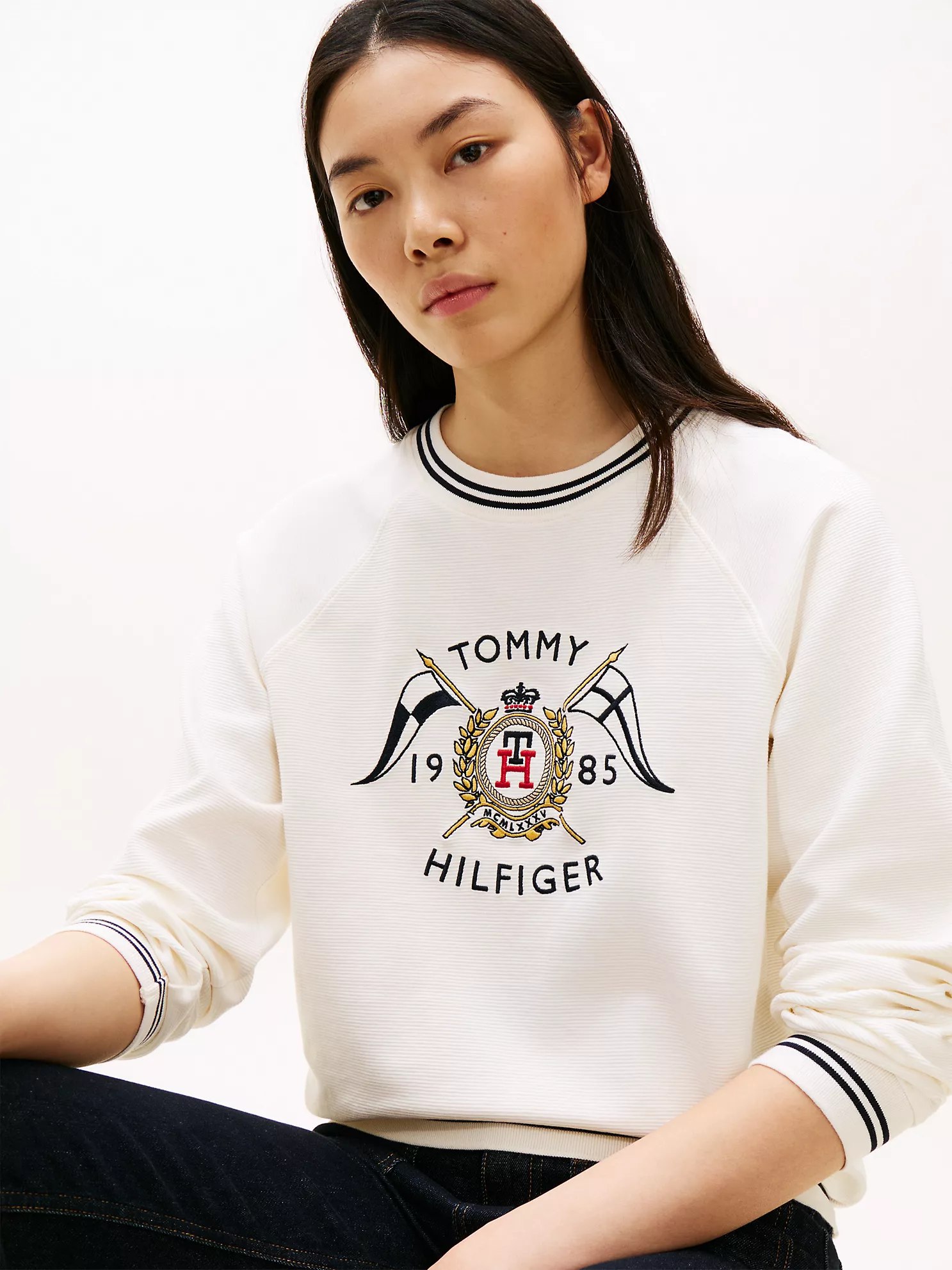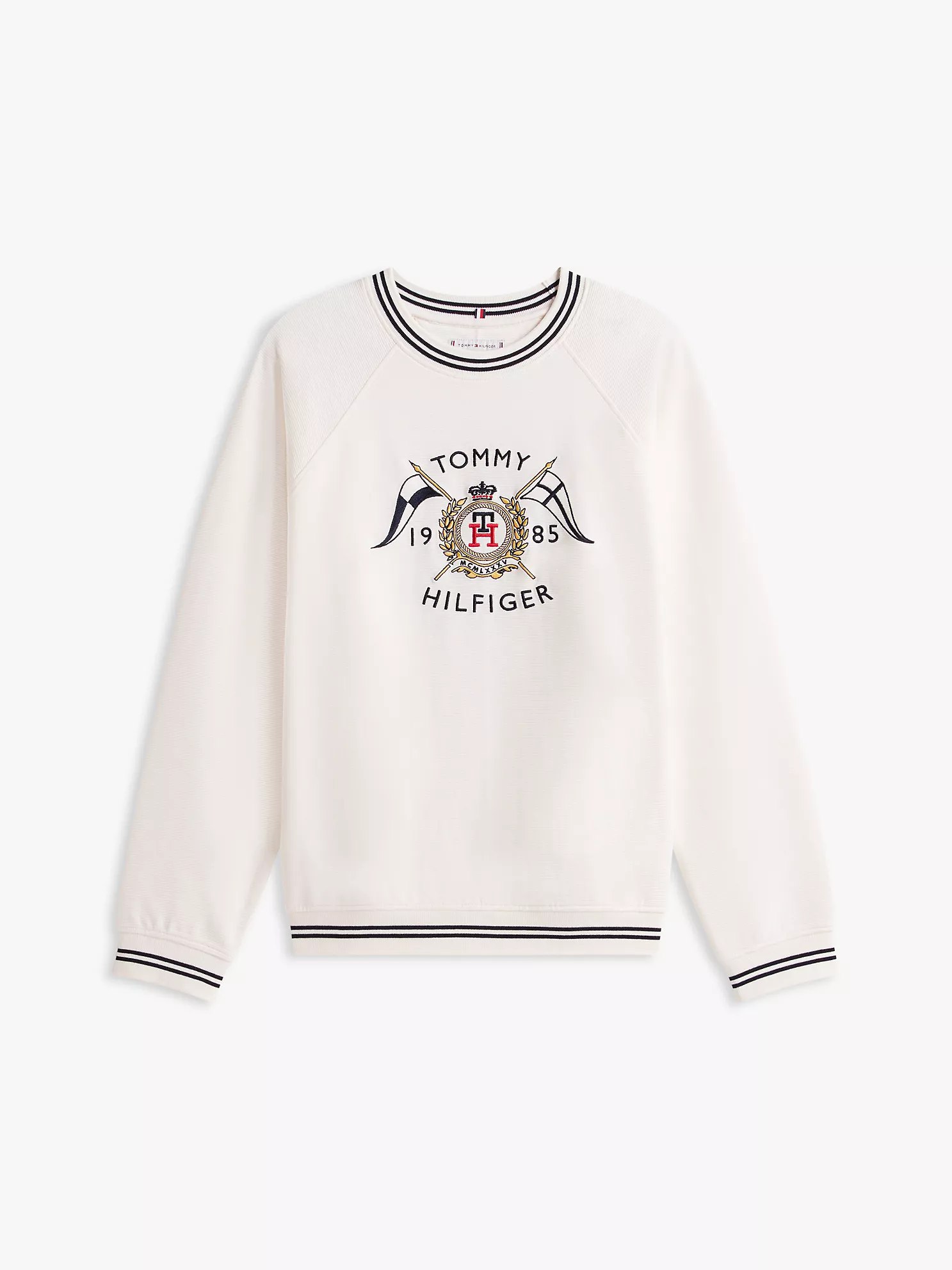 - Crewneck, tipped trim, nautical crest at the front.