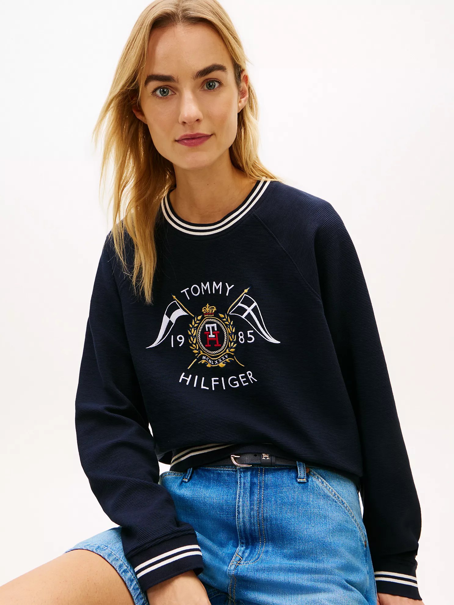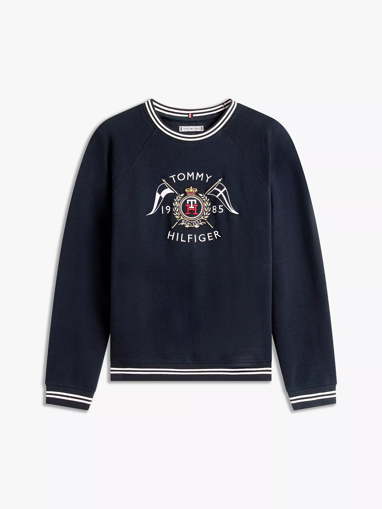 Tommy Hilfiger women’s sweatshirt. Made from a cotton blend and garment-washed for softness, our nautical crest logo sweatshirt is a comfortable layer with maritime spirit. Wear it for running errands, relaxing at home or coastal adventures.