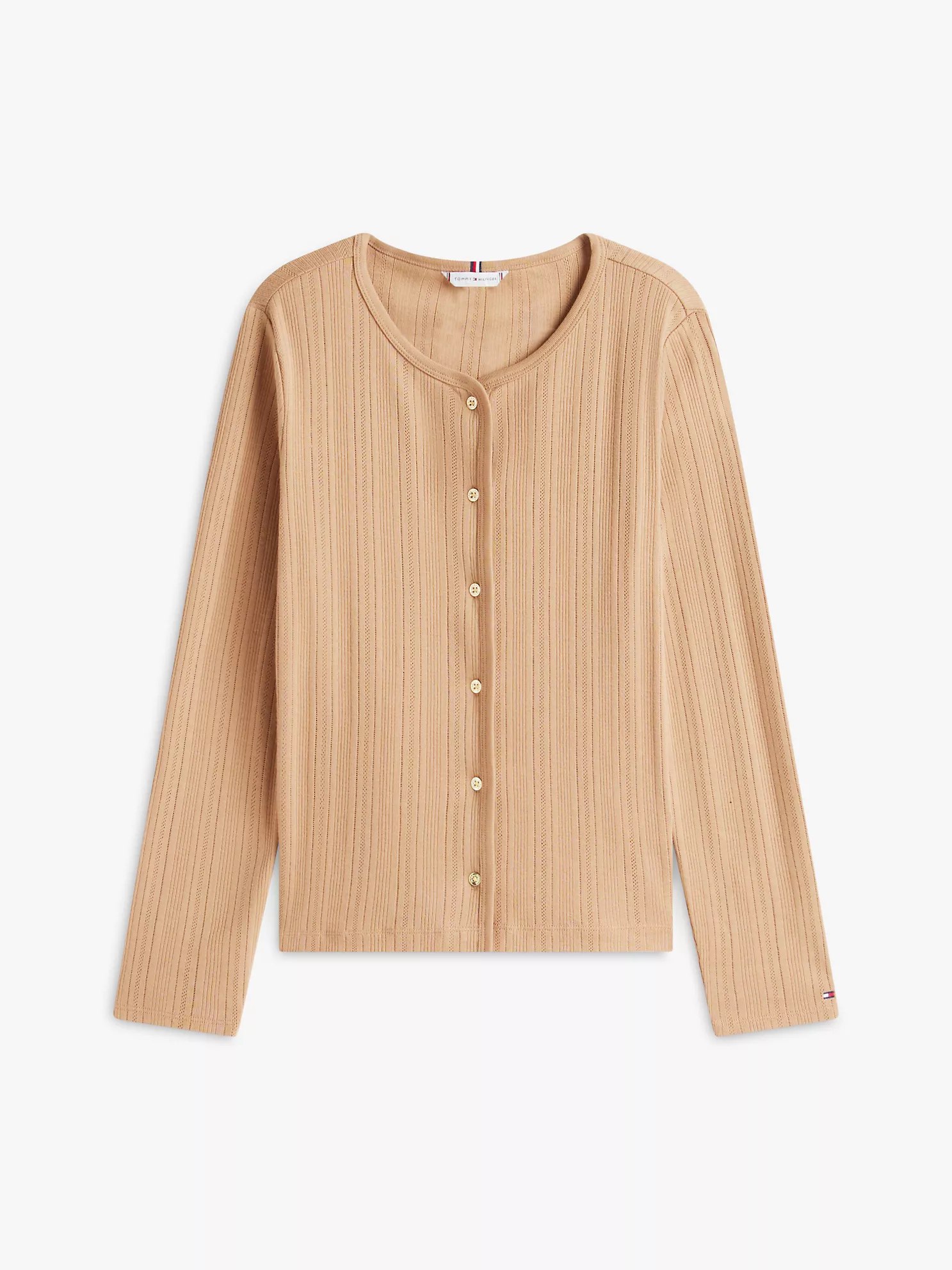 Tommy Hilfiger women’s T-shirt. This versatile button-up cardigan tee is made from lightweight cotton in a breathable pointelle weave for easy layering. Style it open over a tank top or fully buttoned as a stand-alone piece.