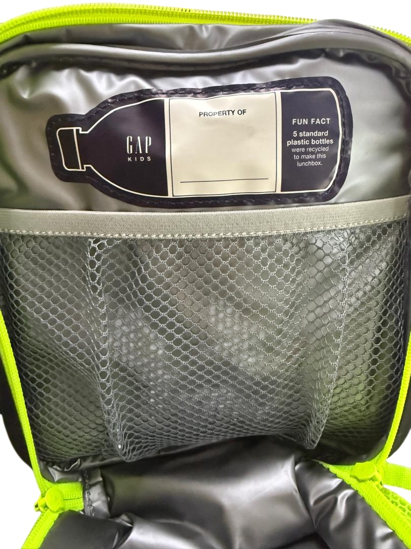 Made with 60% recycled polyester. Fun Fact: 5 standard plastic bottles were recycled to make this backpack. Sturdy weave. Flattened front pocket. Water bottle section with mesh. Interior front pocket. “Property Of” water bottle name tag inside. Dinosaur scales at front are 3D.