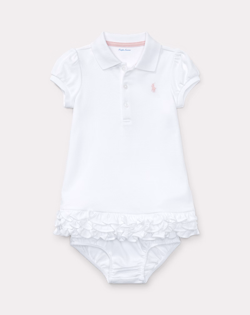 Puffed sleeves and a ruffled hem bring playful charm to this smooth cotton version of Ralph Lauren’s signature Polo dress. A matching bloomer completes the set.