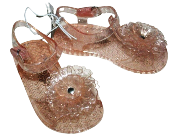 - EUC Old Navy Flower Clear Sparkle Jelly Sandals, T6. Excellent used condition. Worn once. No flaws or wear. Clean. Translucent jelly sandals with multi colored sparkles. Large layered flower with center rivet on the vamp. Secure-close hook& loop tab at ankle strap for easy on/off. Firm footbed. Textured outsole. Synthetic materials.