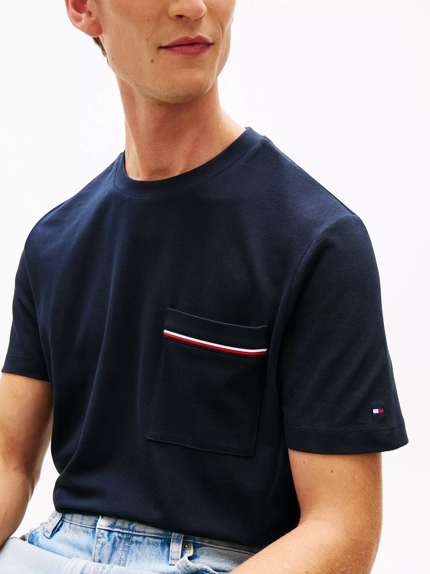 Tommy Hilfiger men’s T-shirt. Our signature stripe pocket tee is made from premium cotton in a pique weave, known for its subtle textured finish that adds dimension and breathability.
